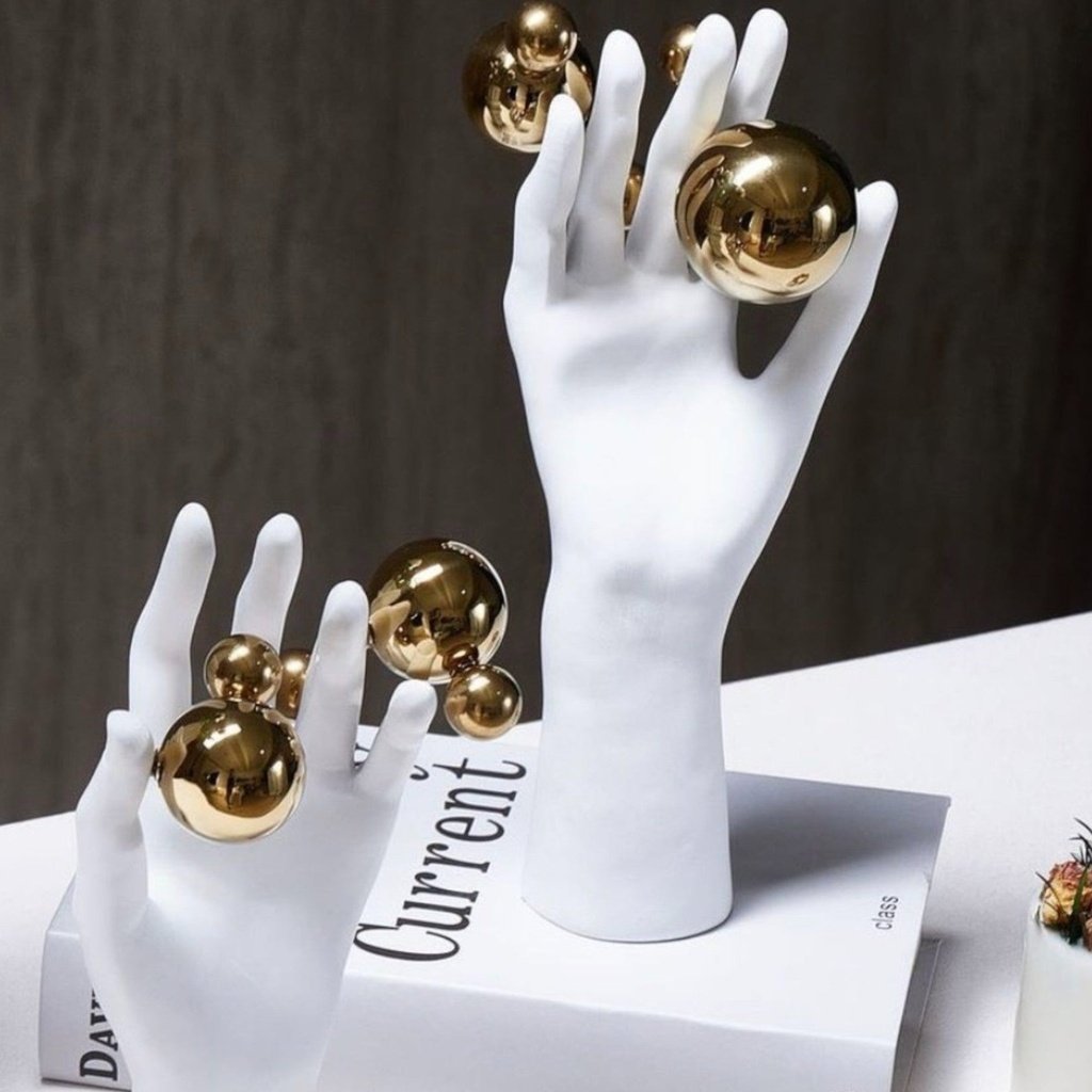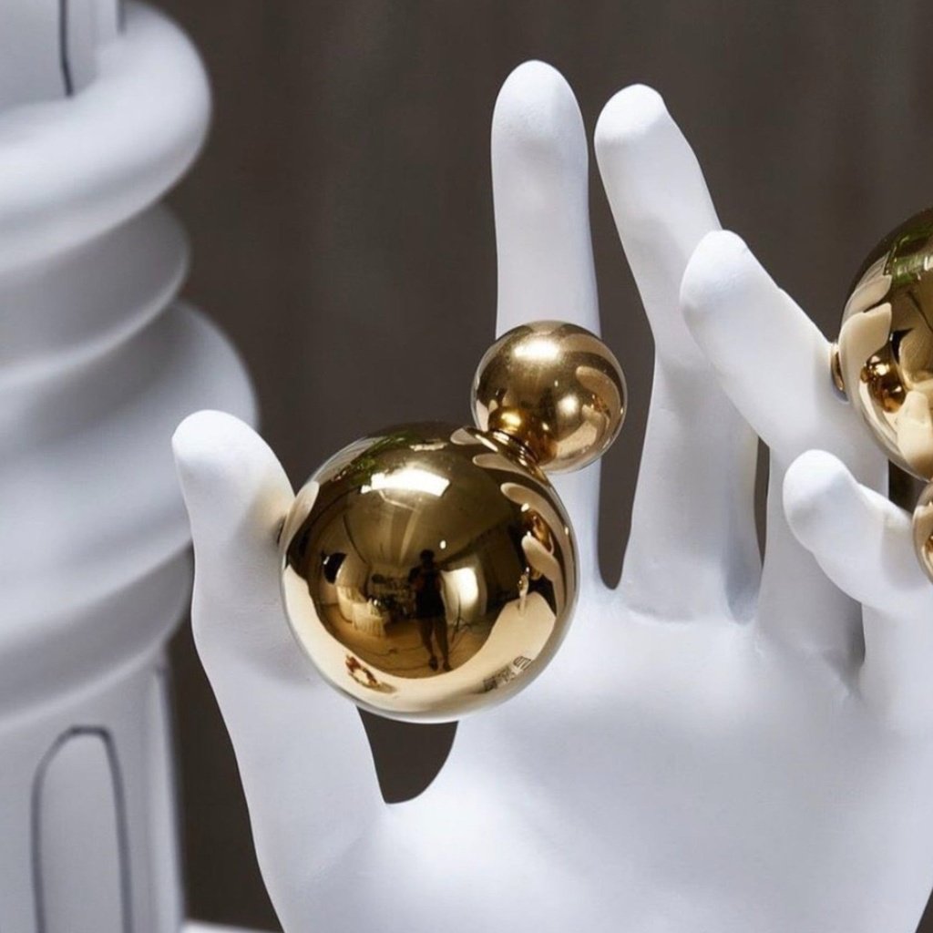 The abstract hand form is intentionally open to interpretation — simultaneously minimalist and expressive. The white finish keeps the silhouette sharp and contemporary, while the gold globe baubles introduce a layer of visual intrigue without overwhelming the piece.