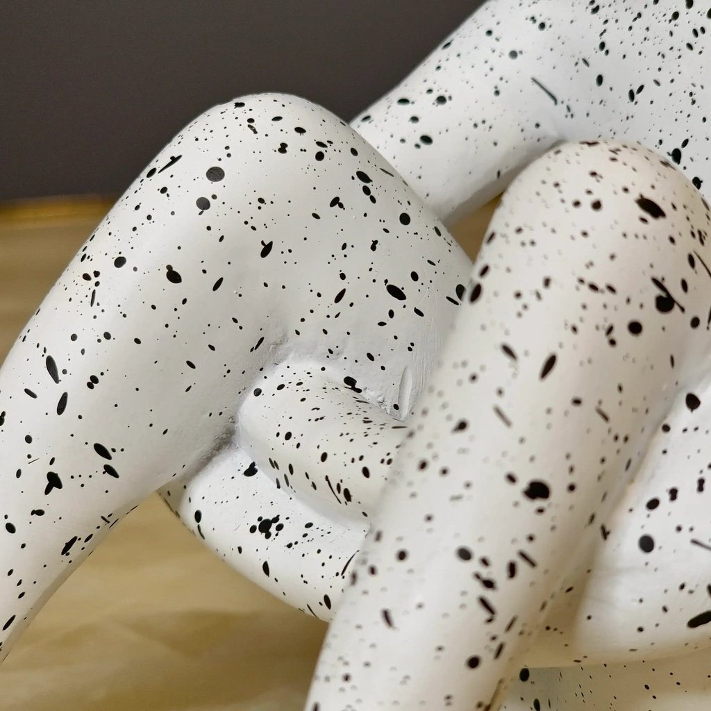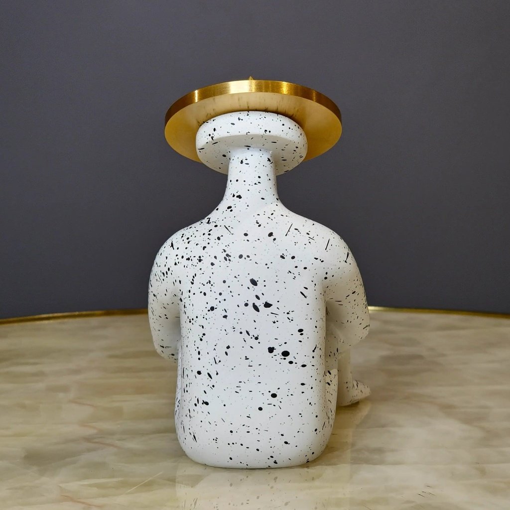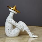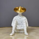 Add a touch of modern artistry to your home with this unique abstract sitting decor piece. With its speckled white finish and a striking golden hat, it effortlessly combines elegance and minimalism. It’s perfect for anyone looking to make a sophisticated statement in their living space.