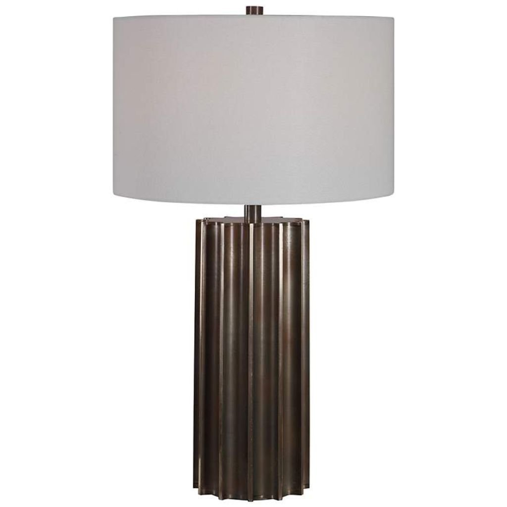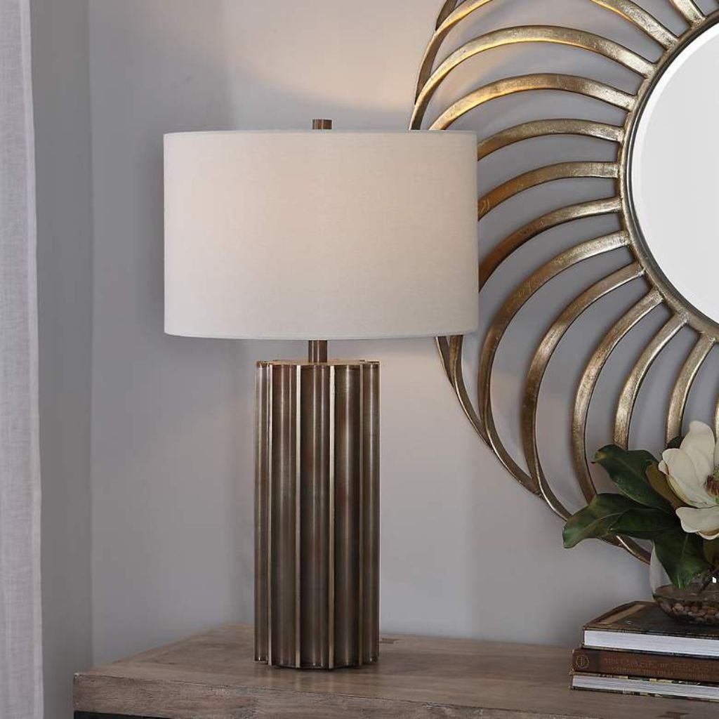 The tall, structured silhouette features deep fluting for a sculpted, architectural effect. The aged gunmetal finish conveys depth and richness, complemented by subtle rust distressing and brass-plated edge details. Topped with a crisp white linen drum shade, the lamp delivers a soft, warm glow that enhances the room’s ambiance.