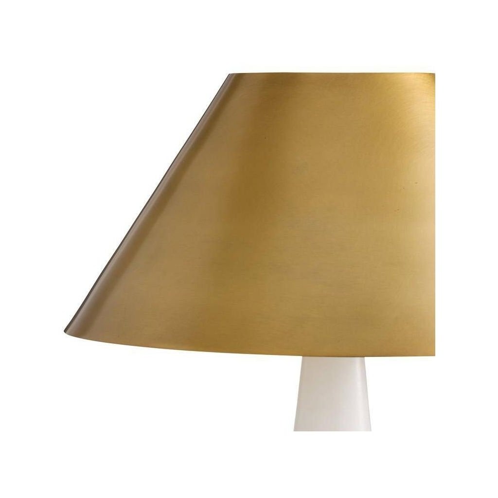 The steel base provides a structural backbone that justifies the lamp’s considerable weight and longevity. The antique brass finish is applied to create depth and tonal variation — darker in recessed areas, warmer and lighter where light catches the surface directly.