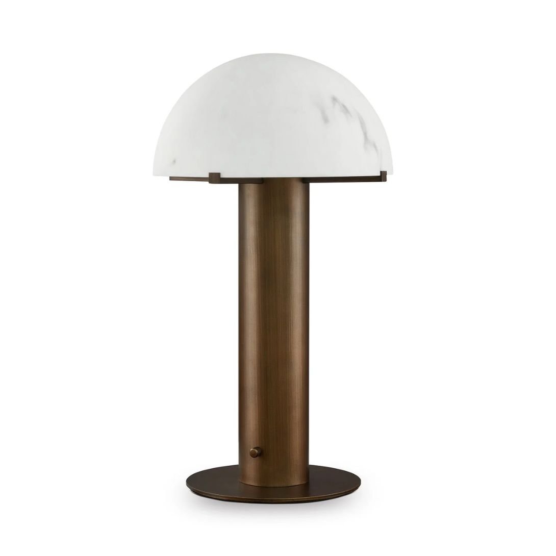 The Aston Table Lamp is a beautifully balanced lighting piece that radiates quiet sophistication. It pairs a serene alabaster dome shade with antique and dark brass detailing, resulting in a sculptural form that feels both modern and timeless. Its softly curved silhouette evokes a calming presence, making it a standout in any refined setting.