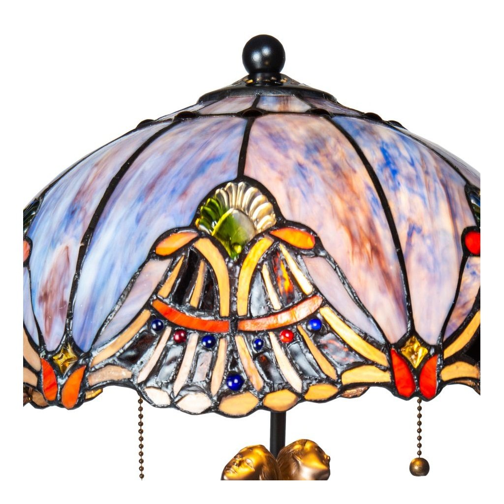 The art glass shade is made using techniques that originated with Tiffany Studios — individual pieces of colored glass joined by metal channels to create a pattern that glows warmly when lit. The effect is distinctive and unlike any printed or fabric shade.
