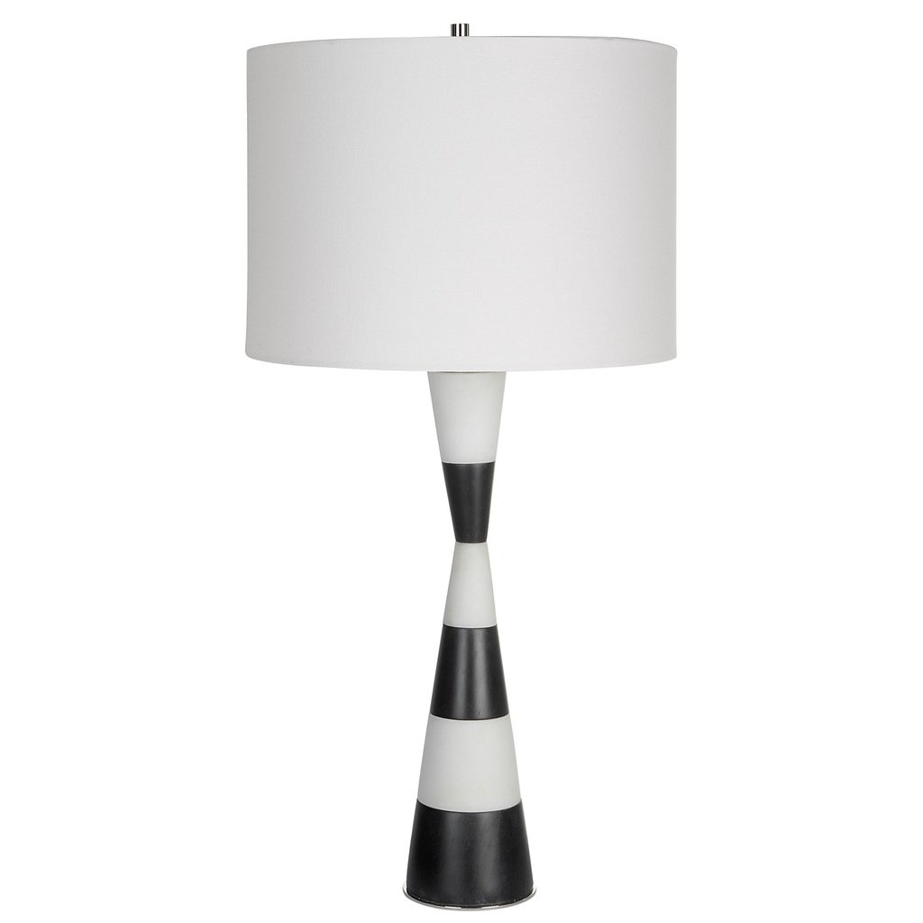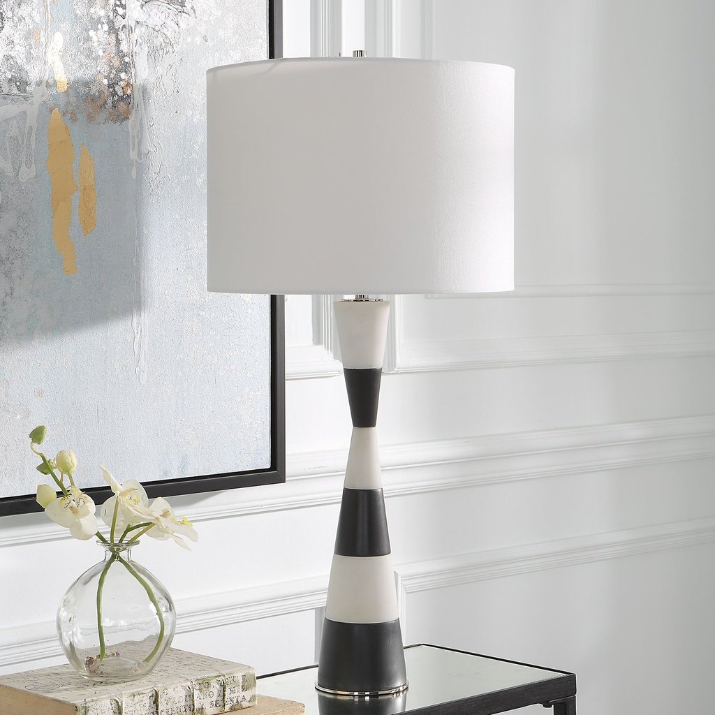 Linen gives this table lamp its distinctive look and feel. The banded black white stone table lamp has the kind of presence that anchors a side table or console without overwhelming the space around it. It delivers quality construction at a scale that works across a range of room setups.