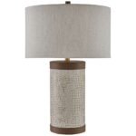 This lamp blends rustic textures with a contemporary silhouette, which is a combination that works well in relaxed, lived-in spaces. The finish references natural materials without being rough around the edges. It suits farmhouse and transitional interiors particularly well.