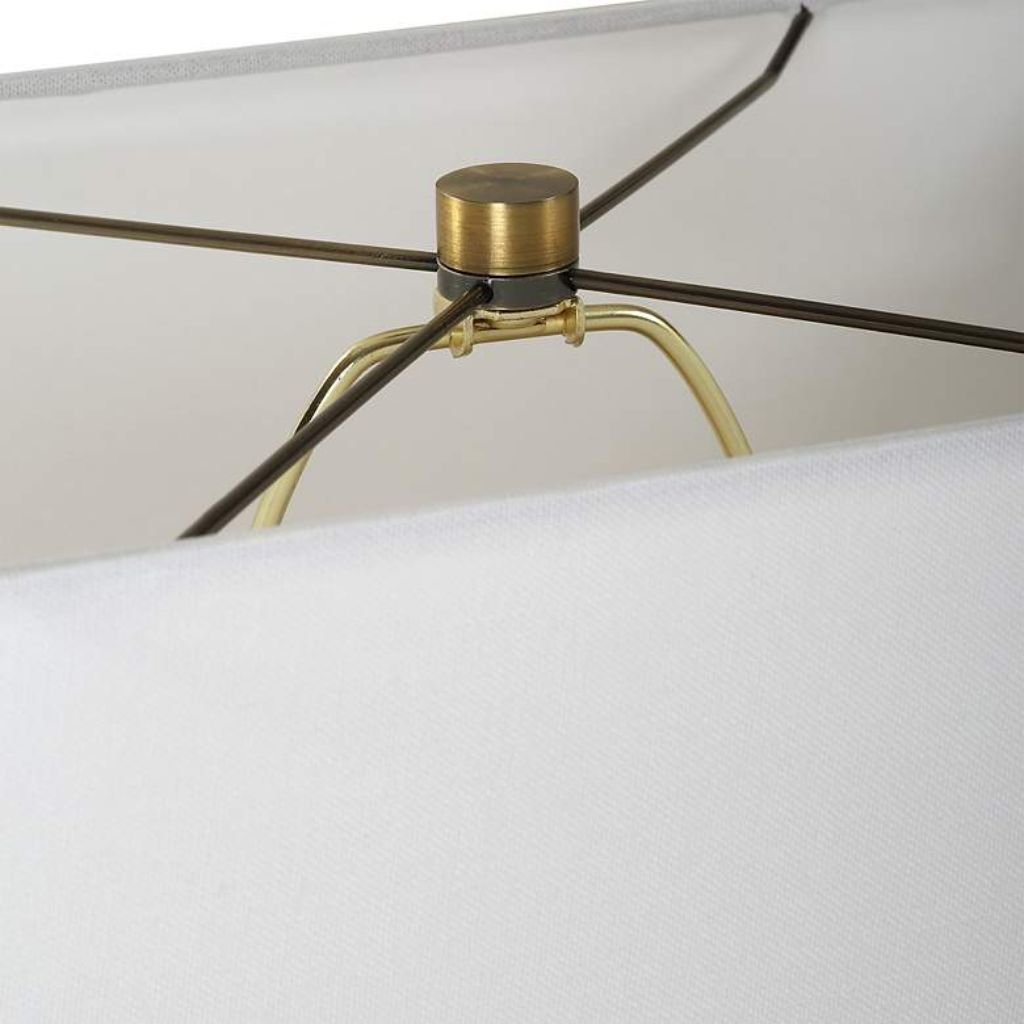 A crisp white linen fabric shade completes the design, measuring 17 inches wide by 10 inches deep and 11 inches high. The rectangular shape complements the sculptural base while diffusing light evenly to create a soft, inviting glow.
