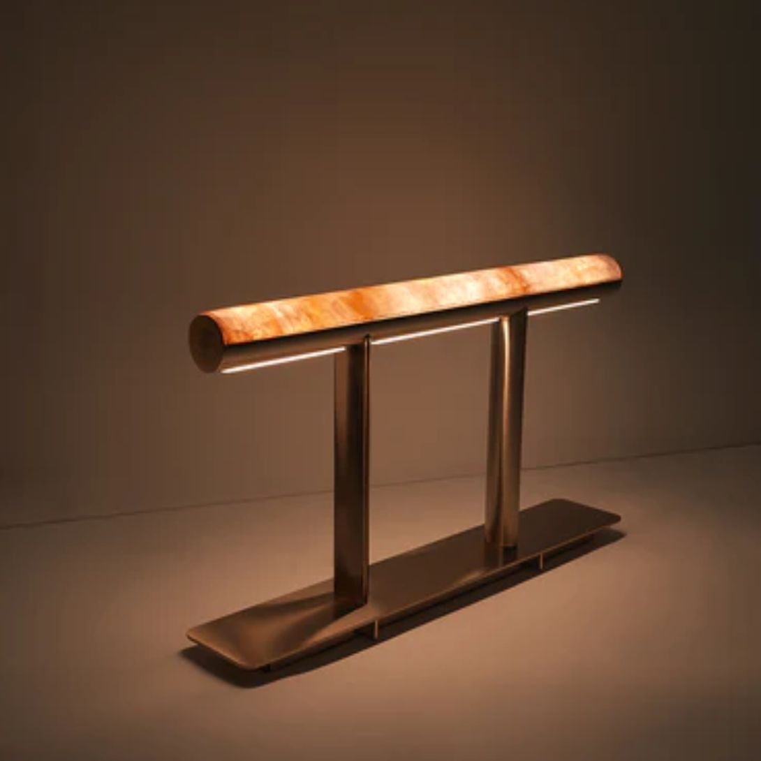 The lamp’s defining bridge-like silhouette is composed of concave and convex cylindrical elements, lending it a unique architectural dynamism. Every curve and contour contributes to its sculptural identity, transforming the lamp from a functional object into a striking focal point.