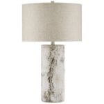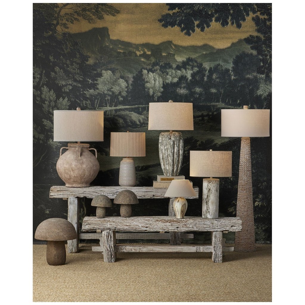 Cement or hydrocal construction gives this lamp a matte, industrial texture that pairs well with wood and natural fiber accents. The material is dense and stable, keeping the lamp grounded on any surface.