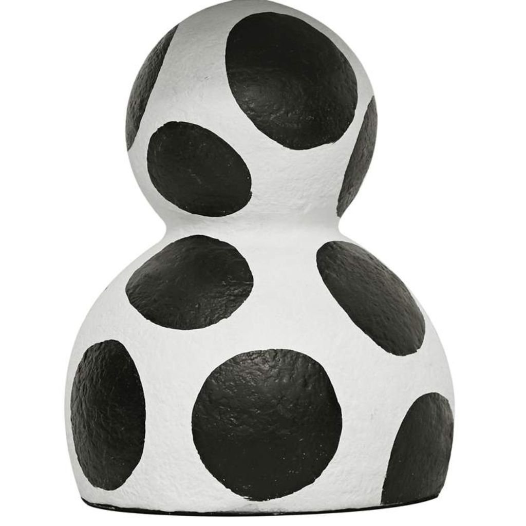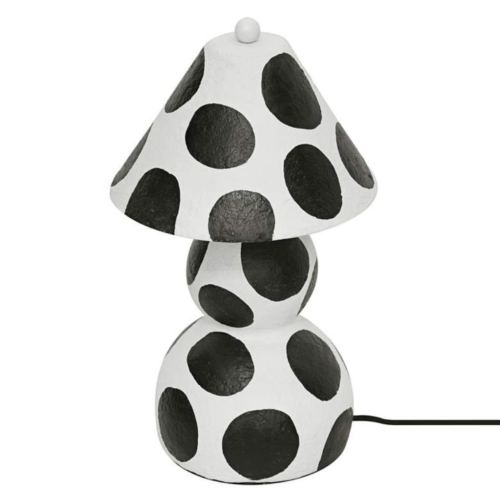 Standing 18 1/2 inches high, the lamp features a curvaceous base crafted from innovative papier-mâché construction. The base measures 14 inches high by 8 inches wide and is finished in striking black and white with a lively polka dot pattern. Iron hardware provides structural stability while complementing the playful aesthetic.