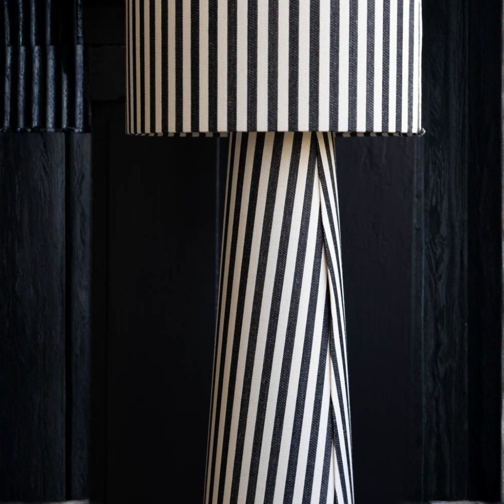 Bold monochrome stripes cover both the base and shade of this floor lamp, creating a seamless, graphic look that draws the eye from top to bottom. The linen-cotton mix fabric is finished with a black flex cable, and the curved base subtly distorts the vertical stripes for a playful, unexpected detail. At H130cm, it stands with presence.
