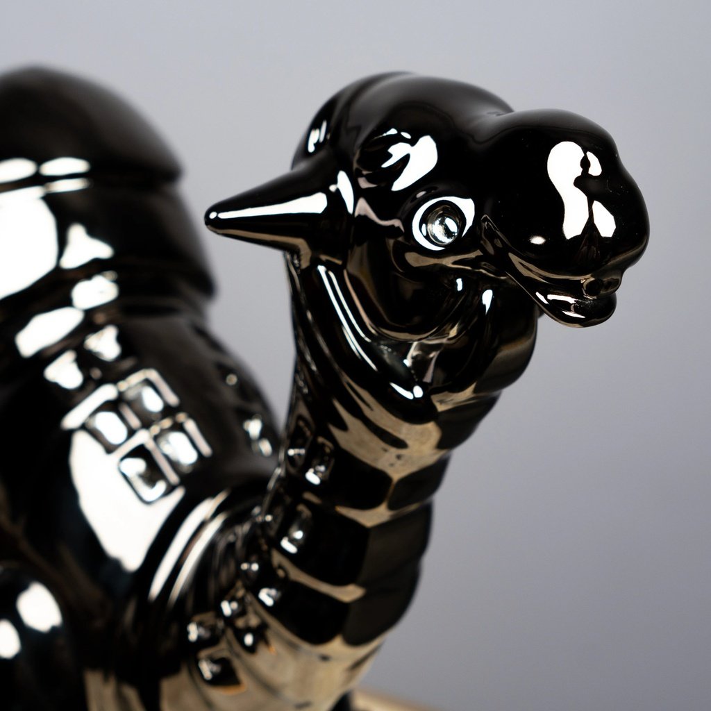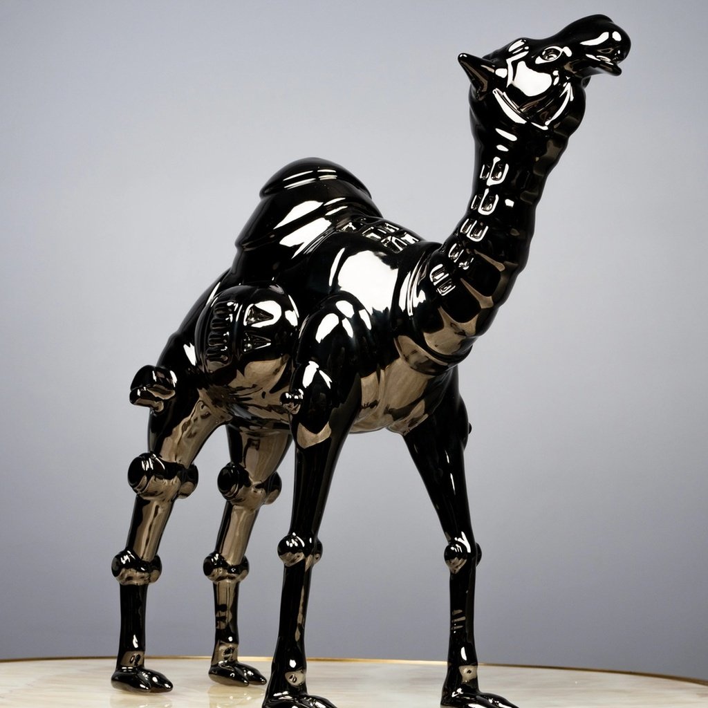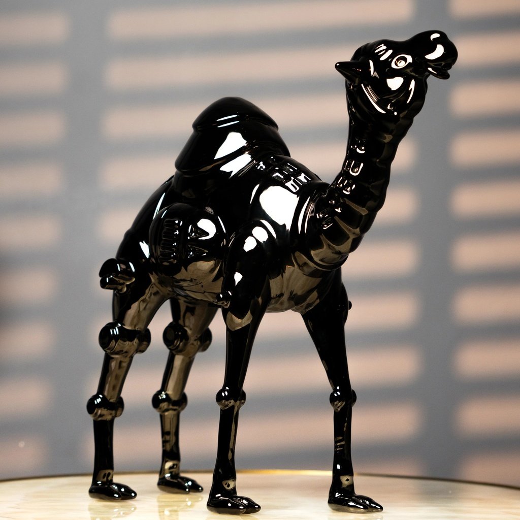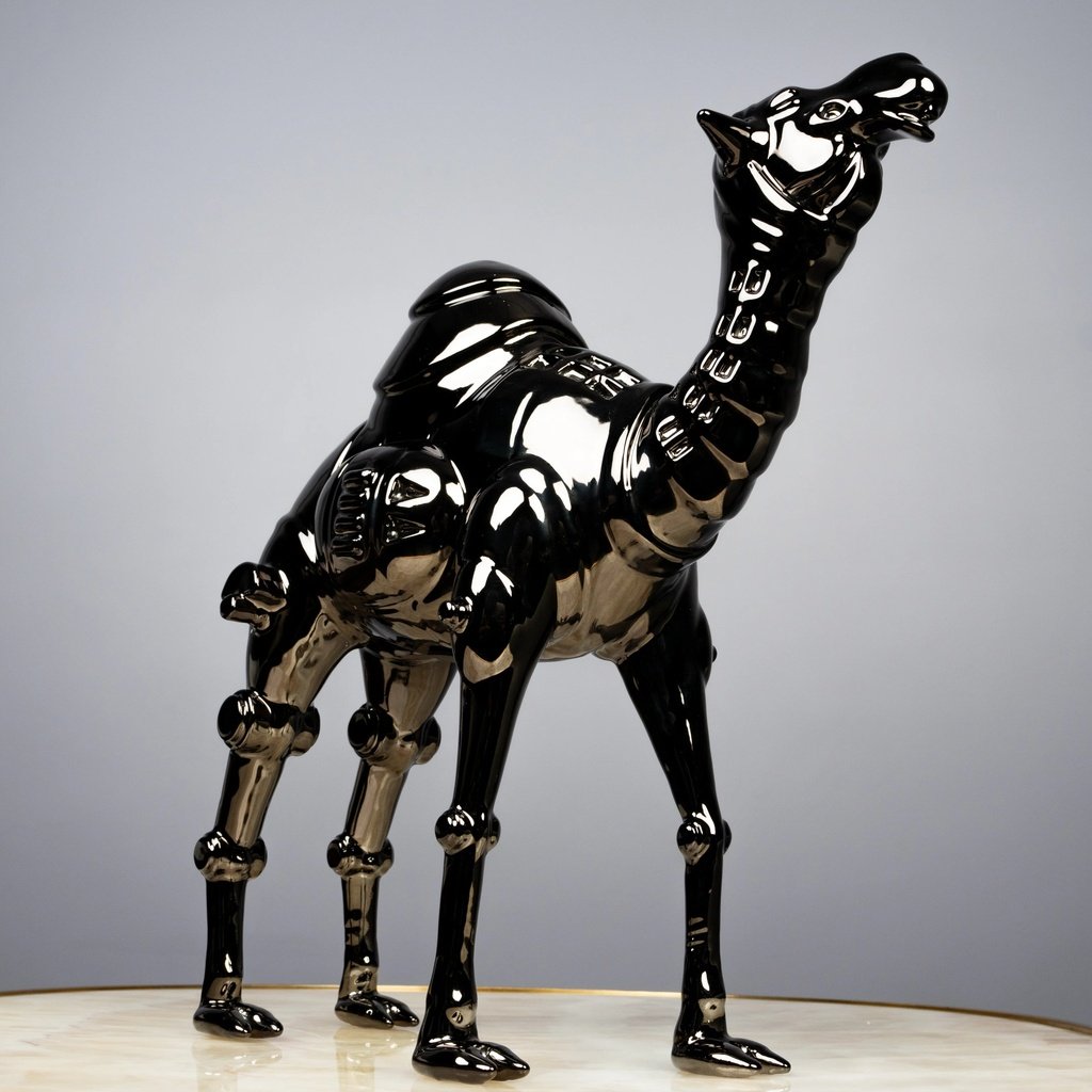 Among the most celebrated famous sculptures of animals in contemporary interior design, the camel form carries cultural weight and visual drama in equal measure. This reinterpretation pushes that tradition forward with a futuristic finish that complements minimalist, industrial, and luxury interiors alike. It pairs beautifully alongside home decor accents, grounding its sleek black form with natural warmth — or commands its own spotlight on a dark sculpture for sale, pedestal or glass shelf.