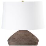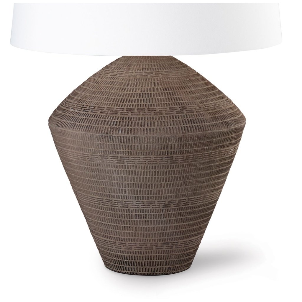 The etched pattern creates shadow and surface variation in the ceramic body, making the lamp visually interesting even without the shade or bulb installed. It’s a detail that rewards close inspection and elevates the piece beyond standard black finish lamps.