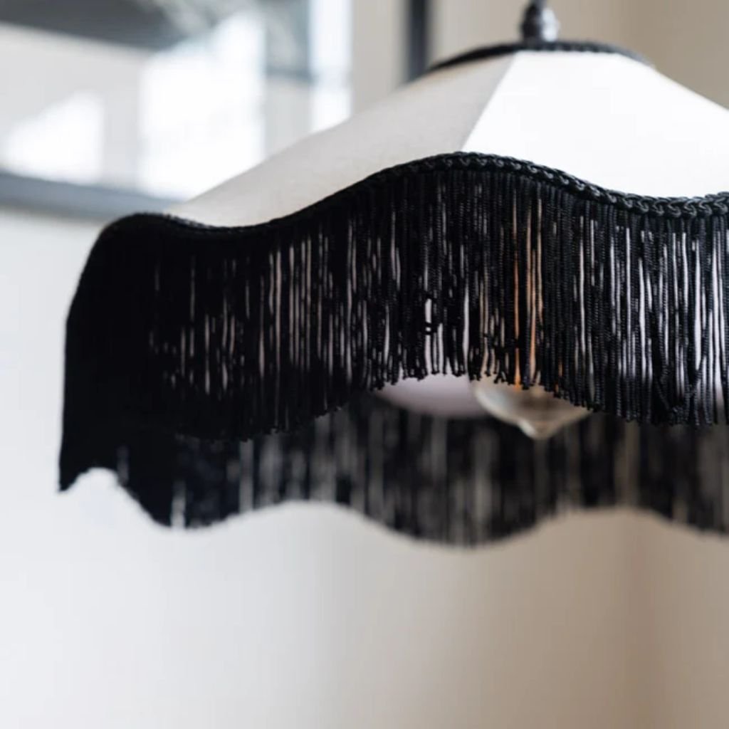 Cream fabric with a wave of bold black tassels and matching black trim creates a tassel ceiling shade that brings Art Deco maximalism to any room. The timeless monochrome palette works with virtually any interior colour scheme, while the fringe adds movement, glamour, and a sense of theatrical vintage charm. It fits existing pendant fittings directly for an immediate impact.