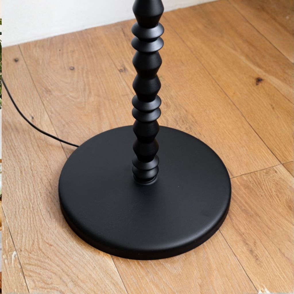 Built from solid wood, this floor lamp features a beautifully carved spindle design that adds a modern sculptural quality to any room. The deep black finish makes it versatile enough to work with almost any interior palette, from neutral minimalism to bold maximalism. This is the lamp base only — pair it with your shade of choice.
