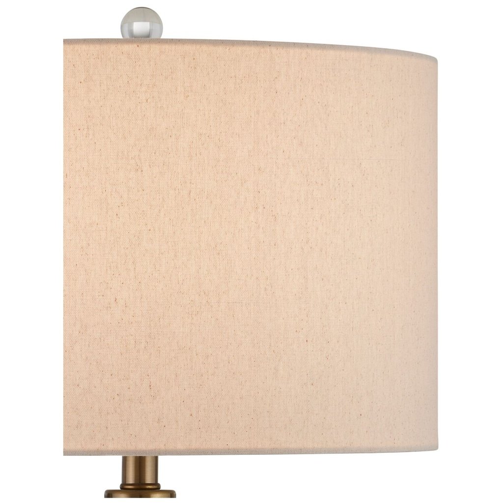 This brass and glass table lamp brings together a striking glass base and warm ambient light, making it an easy choice for bedrooms or living spaces. The base material, crystal, gives this lamp its core character.