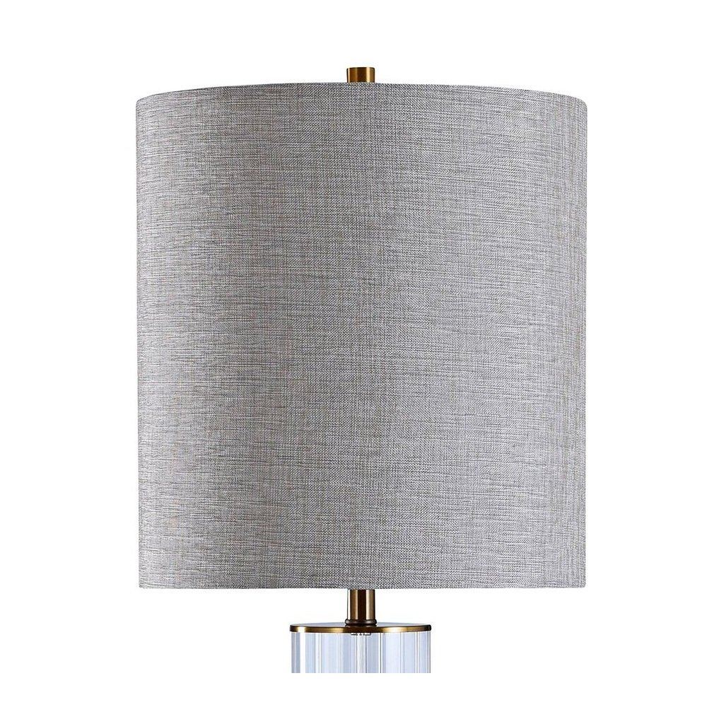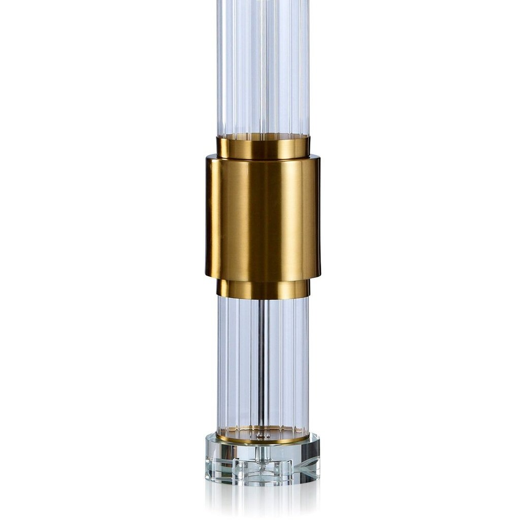 The design here is straightforward — a sleek cylindrical form in brass-finished metal paired with clear crystal accents and a classic linen hardback shade. This brass crystal lamp strikes a balance between stately and contemporary, delivering understated sophistication without leaning too heavily into either direction. At 43 inches tall, it commands vertical space with an elongated silhouette that draws the eye upward and fills a room proportionally.
