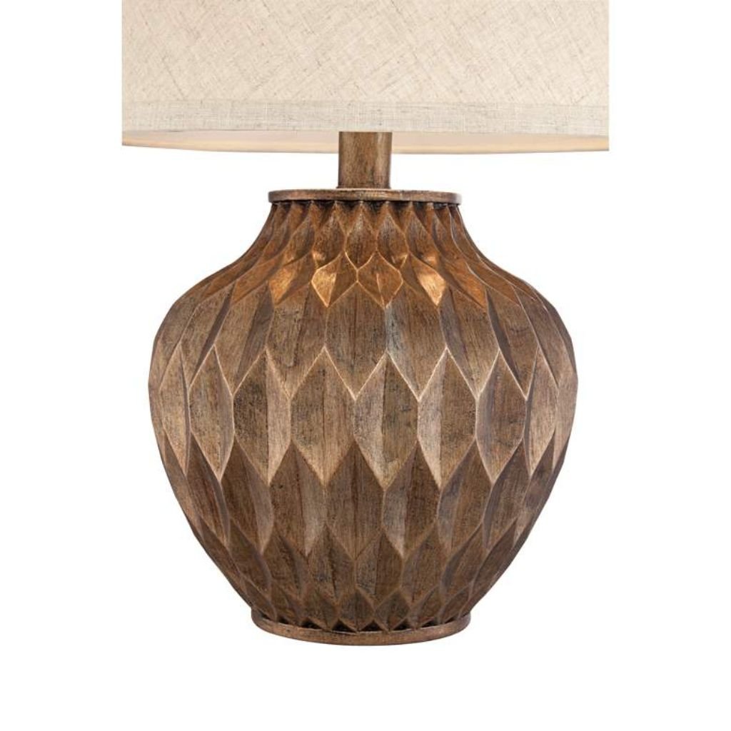 The lamp is topped with a tapered drum shade and matching bronze finish finial, softly diffusing light and completing the contemporary look. Its warm metallic tones and sculptural silhouette make it a versatile piece for any décor style.