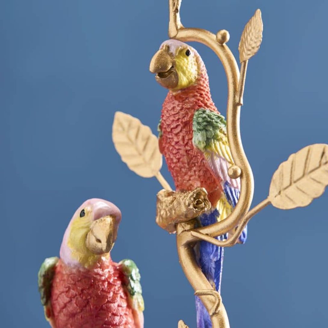 The centerpiece features intricately sculpted parrots, painted in a stunning red hue. The vibrant color and lifelike details bring the parrots to life, capturing their natural beauty and energetic spirit. The dynamic pose and expressive features of the birds give this piece a playful yet refined aesthetic, transforming it into a captivating work of art.
