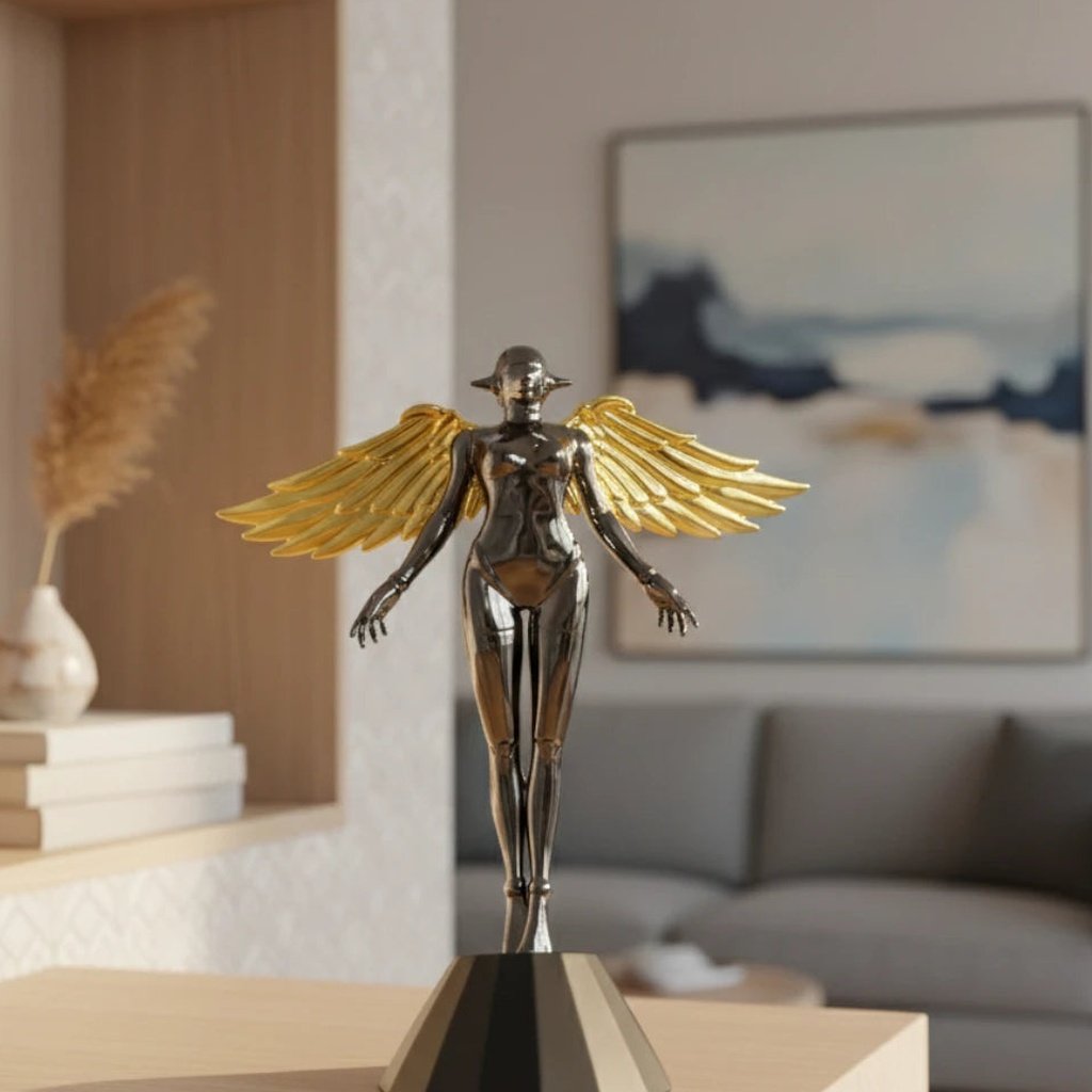 I am absolutely in love with this Celestial Chrome Angel! The sleek, chrome finish is incredibly reflective and gives it such a futuristic, high-end feel. The gold wings are a stunning touch and really pop against the silver body. It’s the perfect size for my entryway table and adds a sophisticated, modern vibe to the whole room. The quality is top-notch, and it feels very substantial. It’s definitely a unique statement piece that always gets compliments!