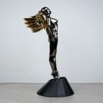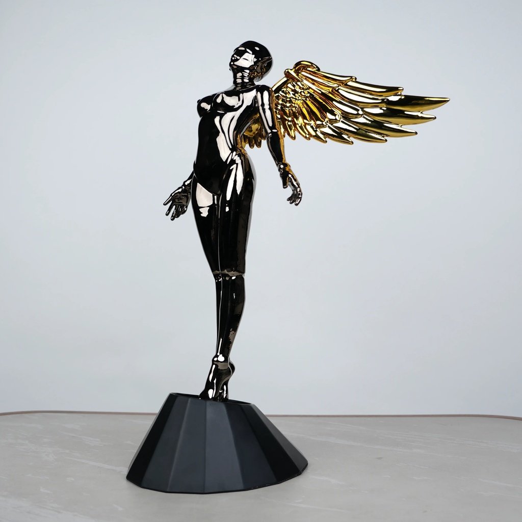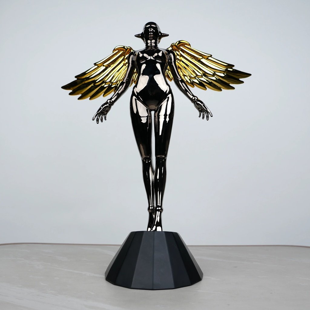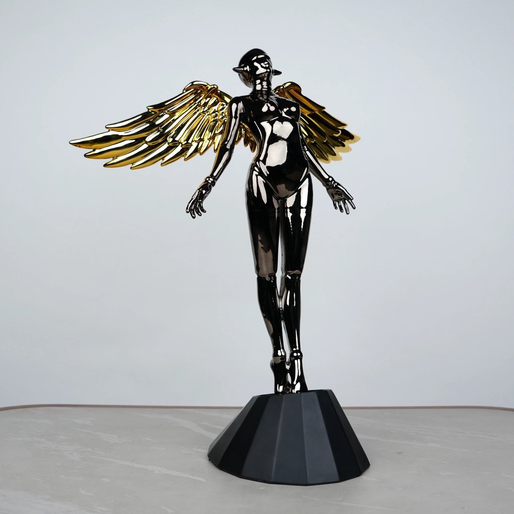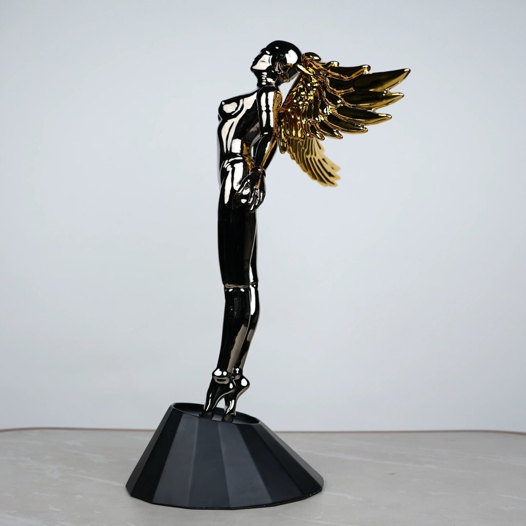 This angel stands tall and proud, with a sleek and elongated pose that draws the eye. Its glossy black chrome finish beautifully mirrors light, creating a dynamic look. The golden wings add a touch of warmth and contrast, making it perfect for both modern and classic interiors.