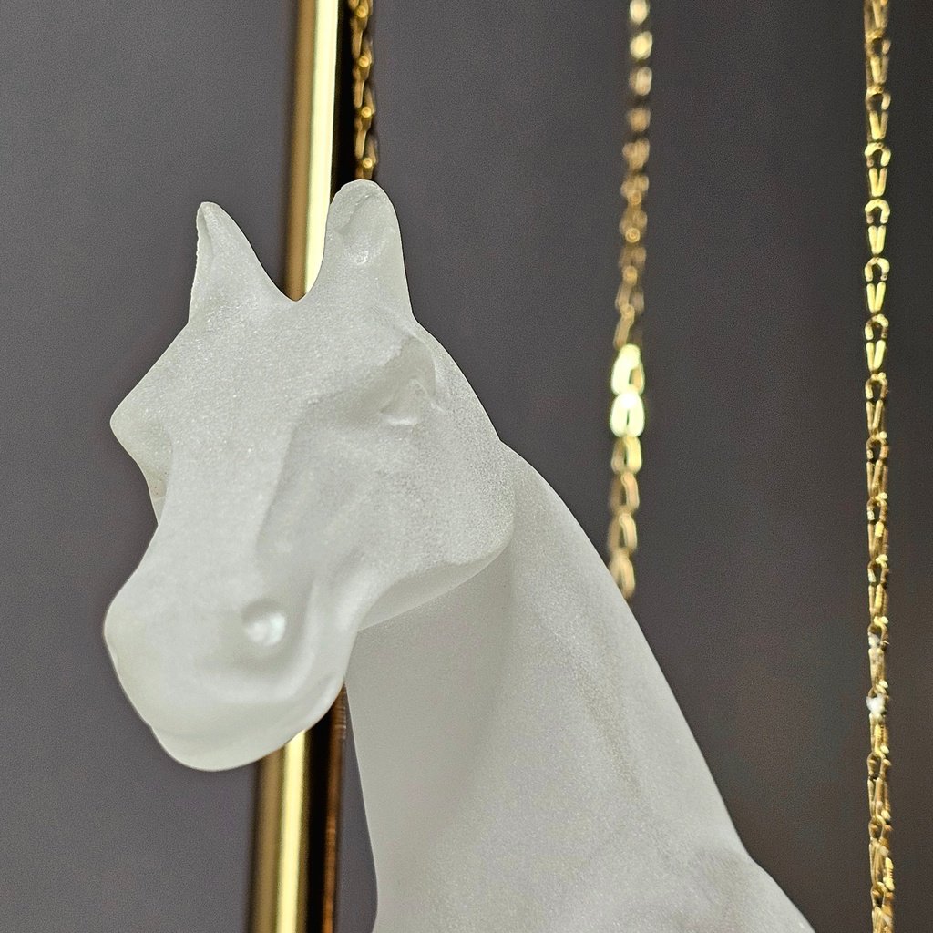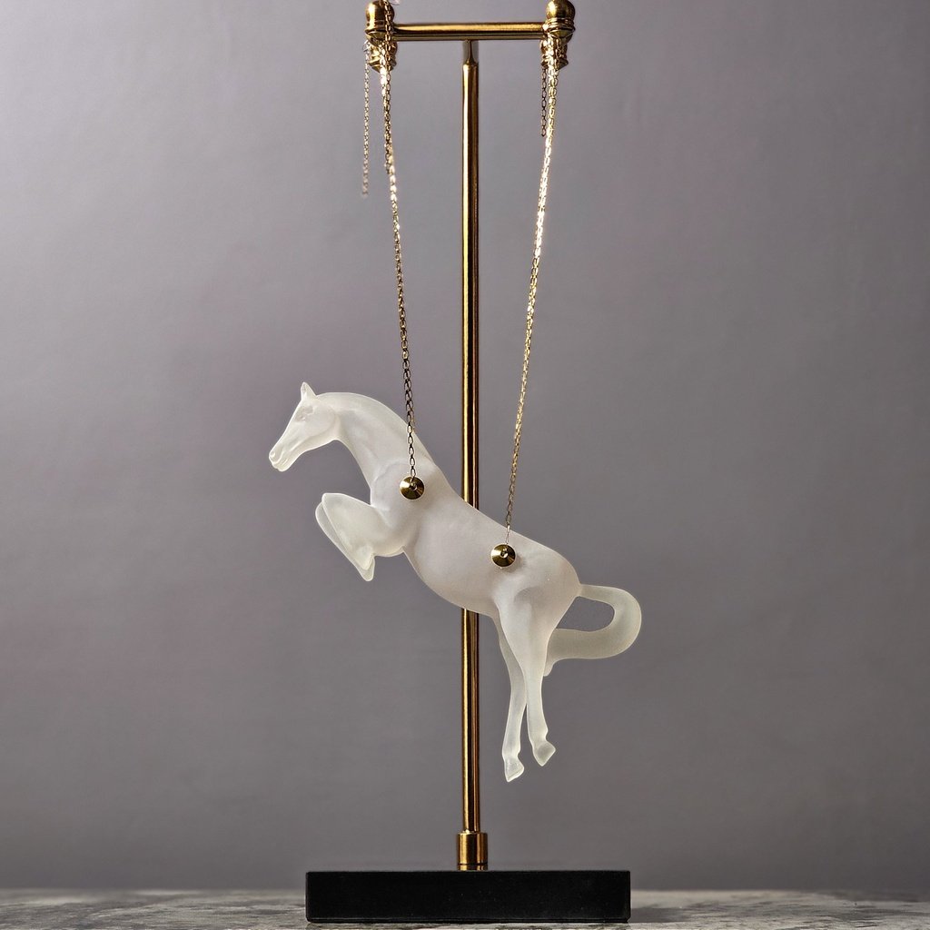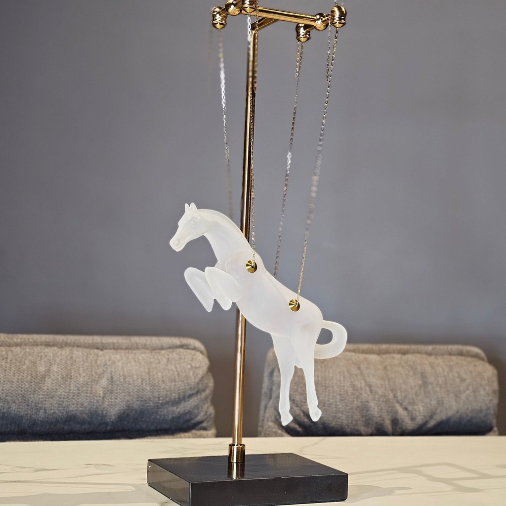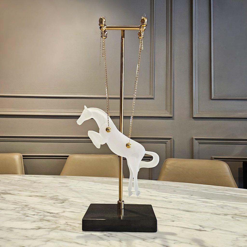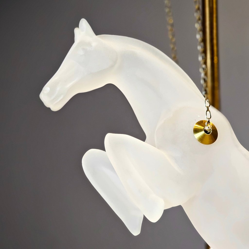 This Celestial Gallop hanging horse is absolutely breathtaking! The frosted finish gives it such an ethereal, dreamlike quality that looks stunning against my marble dining table. I love how it’s suspended by those delicate gold chains—it truly looks like it’s leaping through the air. The gold and black stand feels very sturdy and adds a high-end, sophisticated touch to the whole piece. It’s a total conversation starter and adds so much grace to my home decor!