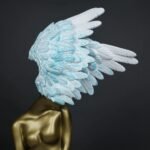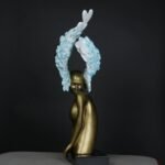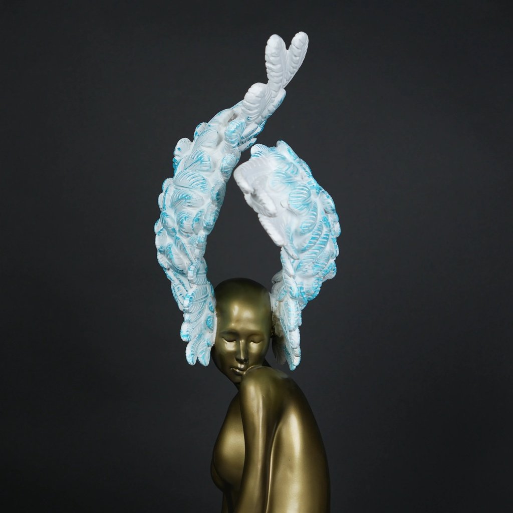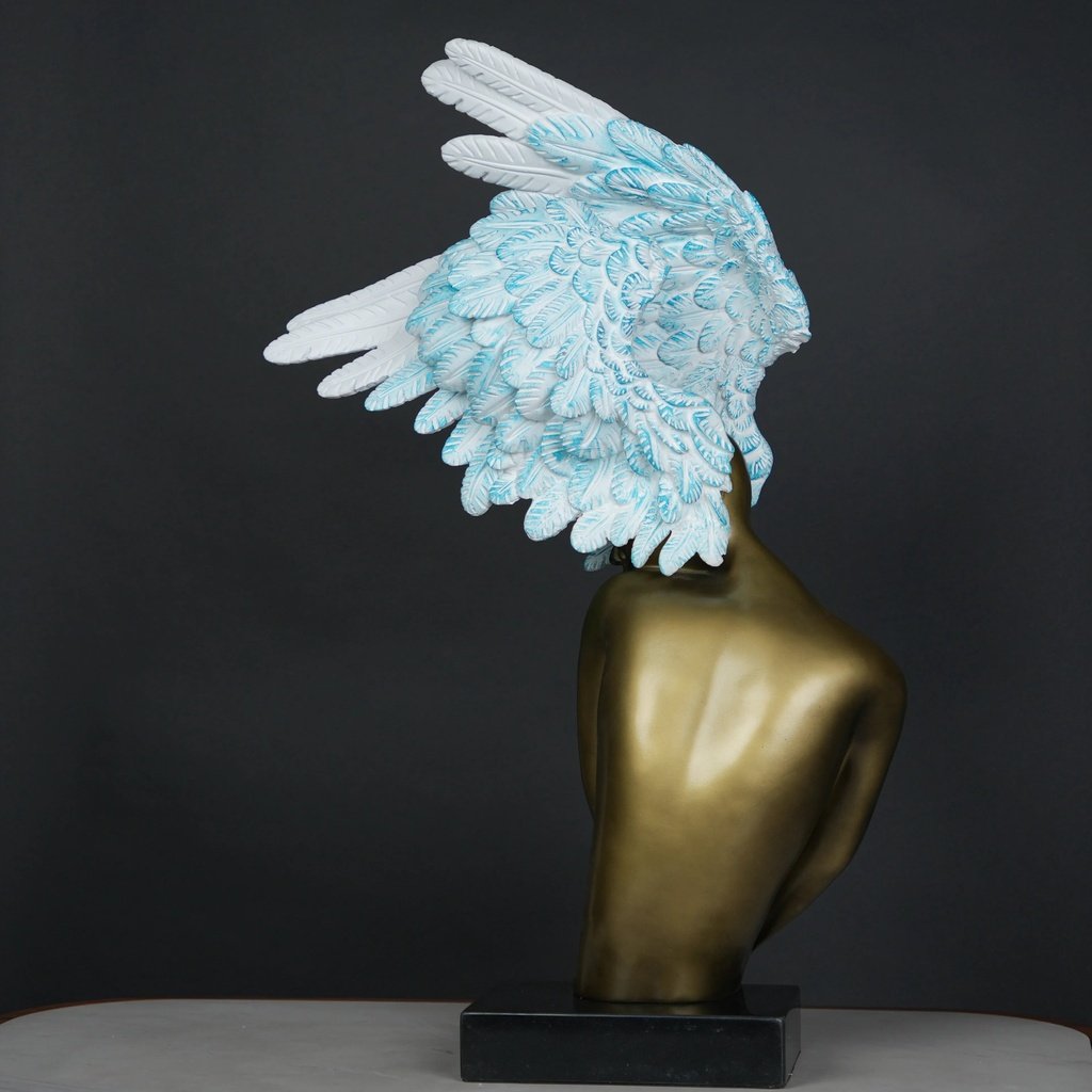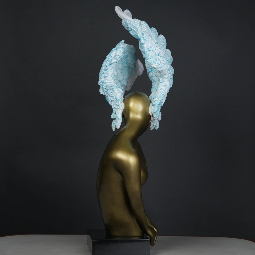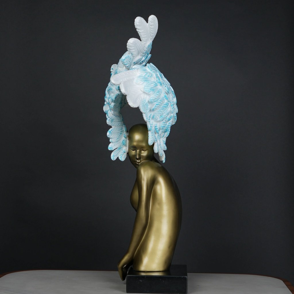 The Celestial Winged Muse is a feast for the eyes. Its beautifully sculpted feminine torso, finished in a warm, satin-gold tone, contrasts strikingly with the soft, feathered wings. The wings’ gradient from white to sky-blue creates a sense of motion and life. It’s a piece that naturally draws attention and transforms any space into a statement of luxury.