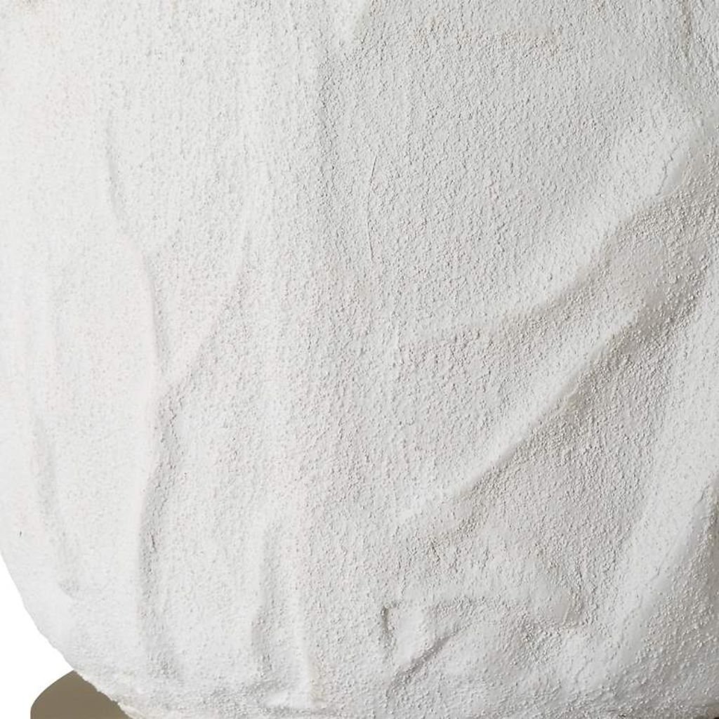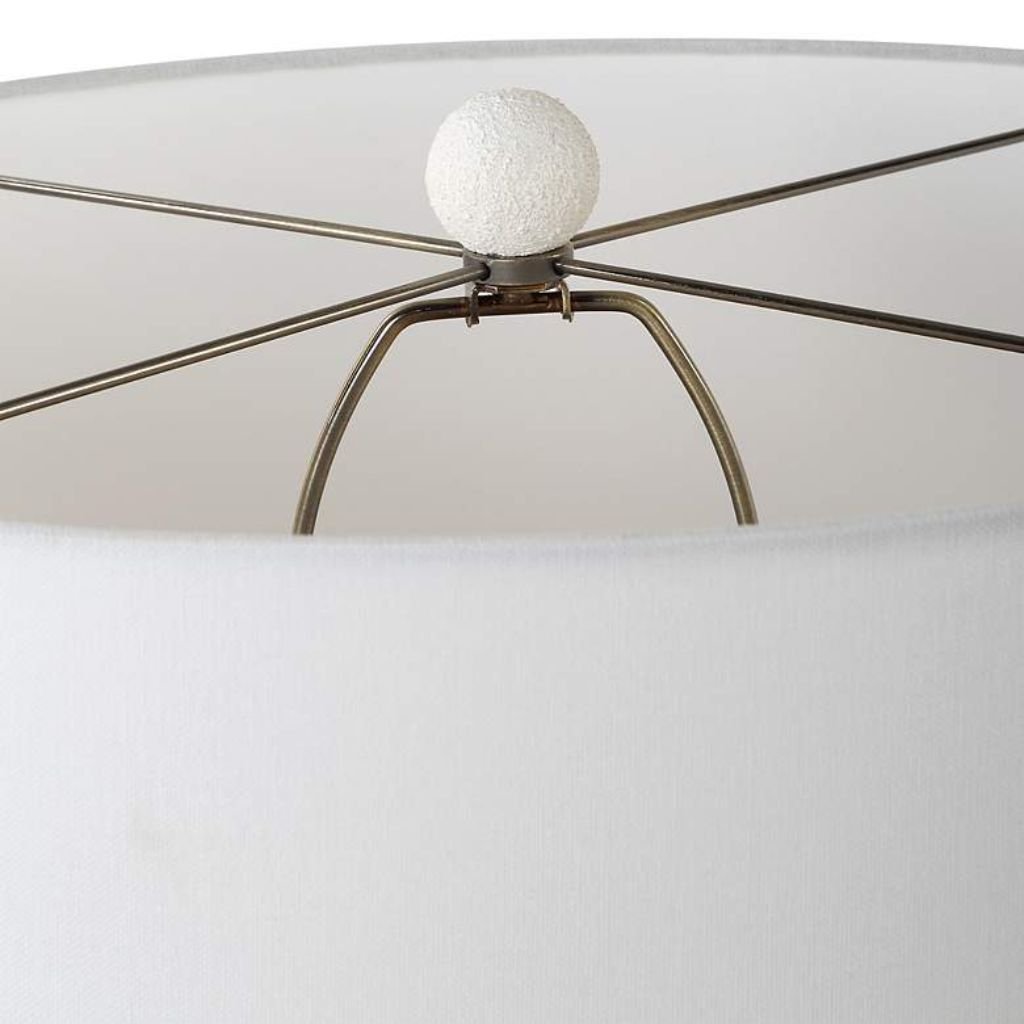 Standing 33 inches tall with a 7 3/4-inch-wide base, this lamp features a ceramic body finished in a chalk white glaze. The textured surface creates visual interest, giving the lamp a sculptural quality while the soft, flowing lines of the base add elegance. Brushed brass plated accents highlight the form and add a touch of sophistication, including a matching finial at the top for a polished finish.
