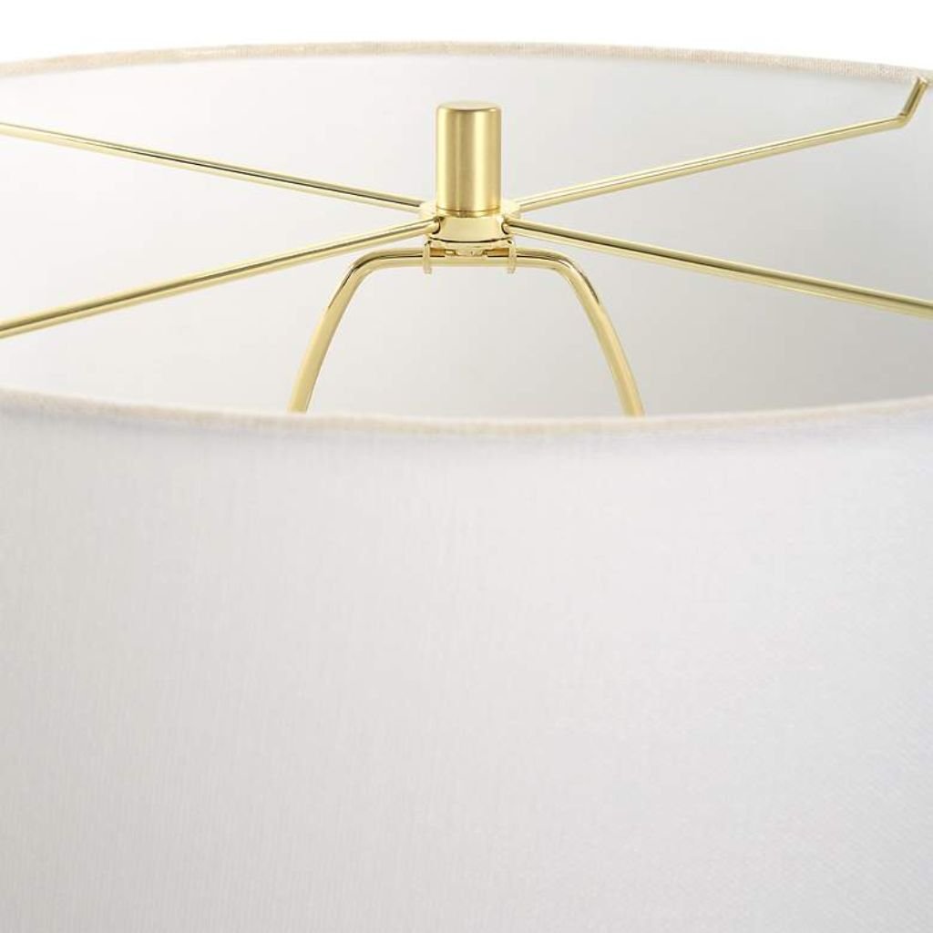 An antiqued brass finish over the steel base adds warm metallic contrast beneath the white porcelain form. The wider mid-section of the base — 11 inches across — gives the lamp a full, generous silhouette that anchors it well on larger surfaces like console tables or nightstands.