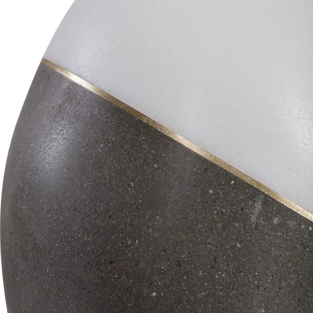 Renee Wightman’s Tanali lamp for Uttermost draws from retro-inspired proportions while staying firmly rooted in modern sensibility. The charcoal and polished white finish creates a crisp, graphic color separation across the ceramic and concrete body — bold without being loud. Brushed gold finish iron accents thread through the design as a secondary detail, adding warmth to what might otherwise read as strictly cool-toned. The vase form itself is classic but rendered with an elongated neck that gives the piece a verticality that reads as intentional and contemporary. It pairs naturally with casual and semi-formal settings alike, holding its own among layered textiles, natural wood, or polished surfaces.