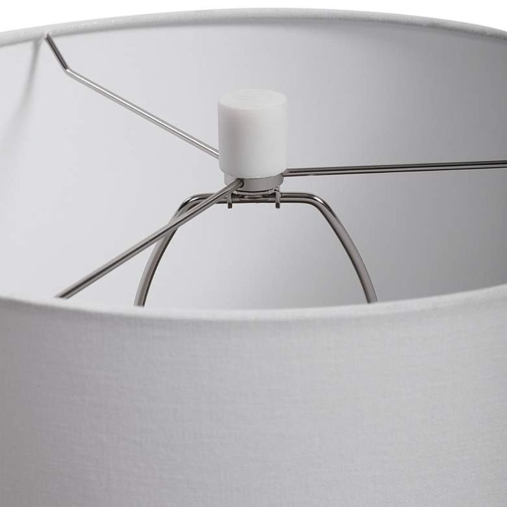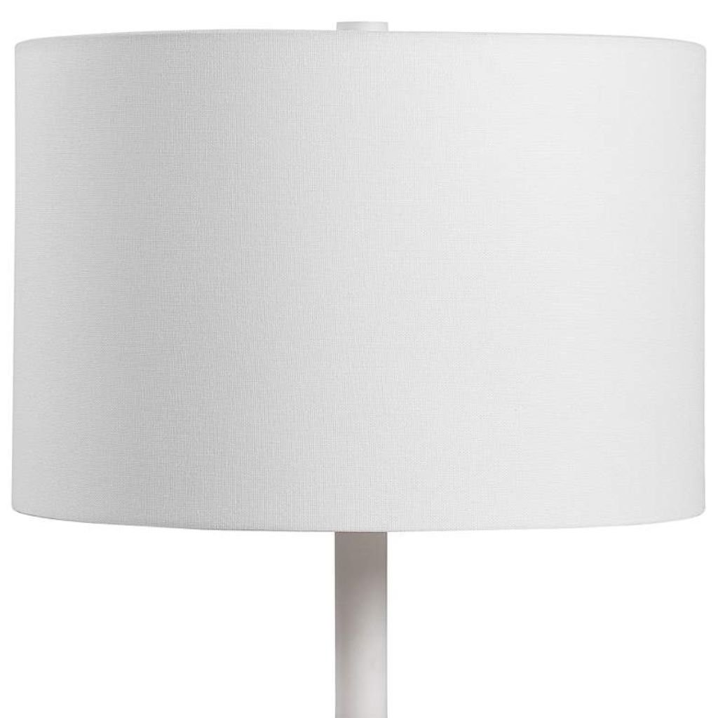 The round white fabric hardback drum shade diffuses light evenly across a room, eliminating harsh spots in favor of a warm, enveloping glow. Paired with a 3-way socket switch, this lamp adapts easily from bright task light to low ambient mood — three distinct levels without touching a dimmer. At its lower settings, the charcoal and white body becomes almost sculptural, the lamp functioning as much as an object as a light source. The 7-foot cord provides generous reach, keeping the lamp flexible in placement regardless of outlet position.