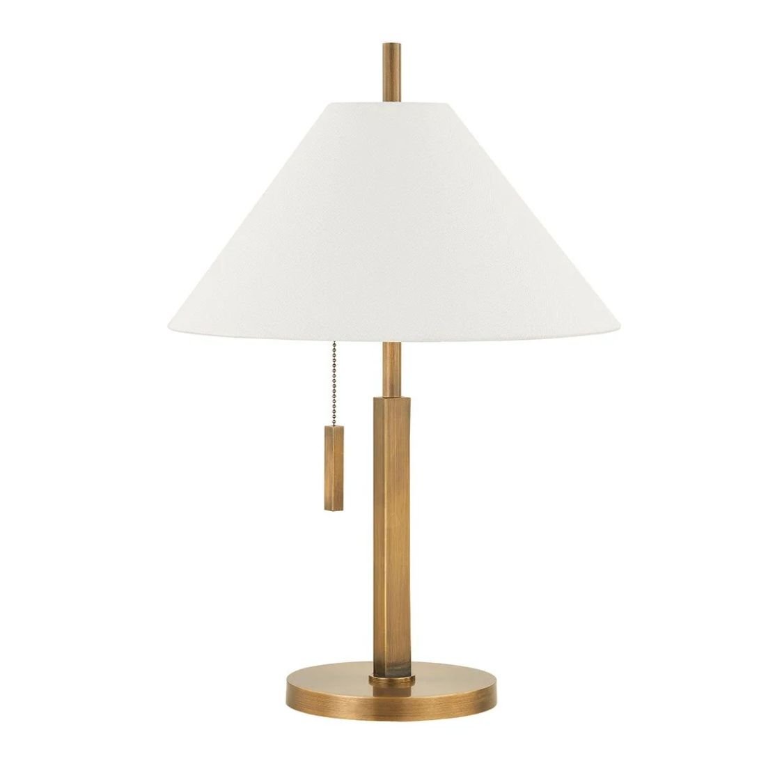 The rich, aged character of the patina brass frame offers a vintage-inspired feel, while still maintaining a sleek and modern silhouette. Topped with an off-white linen shade, it delivers a soft, diffused glow—perfect for creating ambient lighting in living rooms, bedrooms, offices, or entryways.