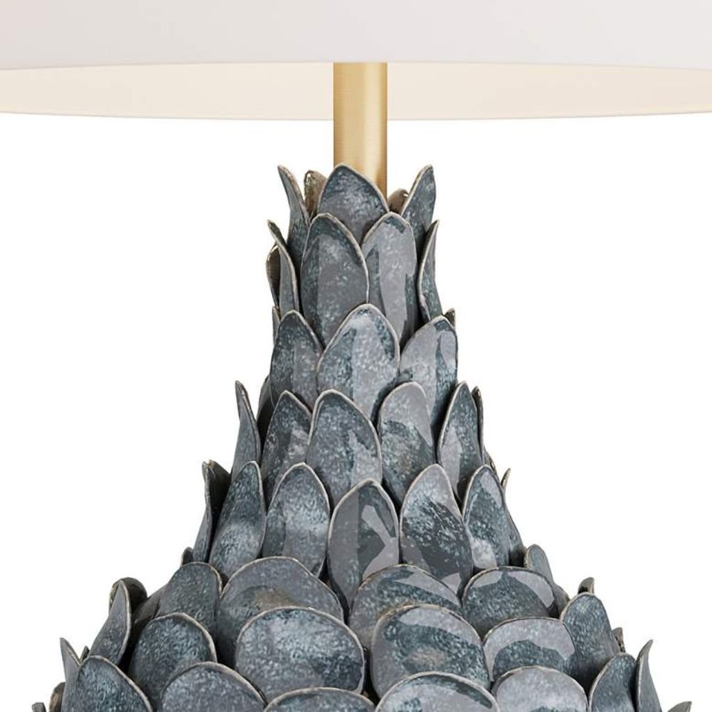 Sculpted ceramic leaves, a glaze pulled from the depths of the ocean, and a silhouette that recalls something grown rather than manufactured — the Aegon by Arteriors Home is a ceramic table lamp that operates on a different level from conventional lighting. Inspired by the layered form of an artichoke, the ceramic base is finished in a reactive glaze that moves through ocean blues with natural variation — no two lamps emerge from the process identically. An antique brass finished support grounds the organic form with a warm metallic contrast, while an ivory microfiber shade lined in off-white cotton keeps the top of the composition light and airy. A matching ceramic finial closes the piece at the top with the same handcrafted intention that defines everything below it.