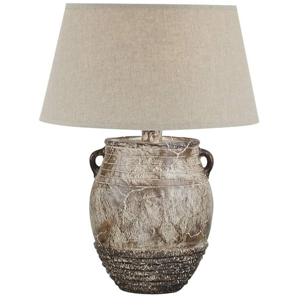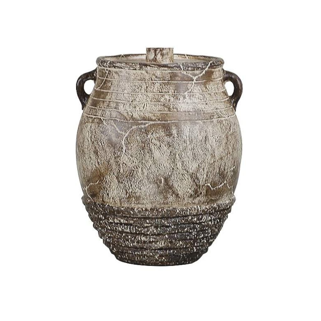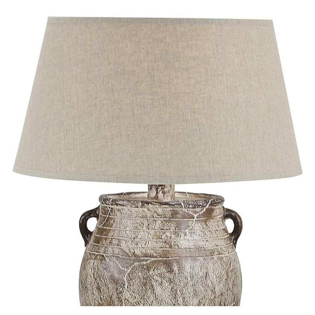 Add rustic character and artisan craftsmanship to your home with this traditional two-handle jug table LAMP. Hand-crafted in the USA, this distinctive piece is made from durable hydrocal (plaster) and designed to evoke the charm of a well-loved antique. Its sculptural silhouette and weathered detailing create a warm, timeless accent for living rooms, bedrooms, or entryways.