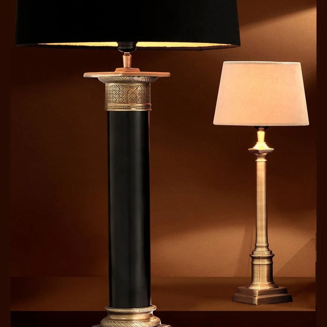 Add a refined touch to your home with the Cologne S Table Lamp, designed to create a striking ambient focal point in any interior. Its tall, elegant antique brass column base brings a vintage charm, perfectly contrasted by the soft beige velvet lampshade, making it an ideal accent for both modern and classic spaces.
