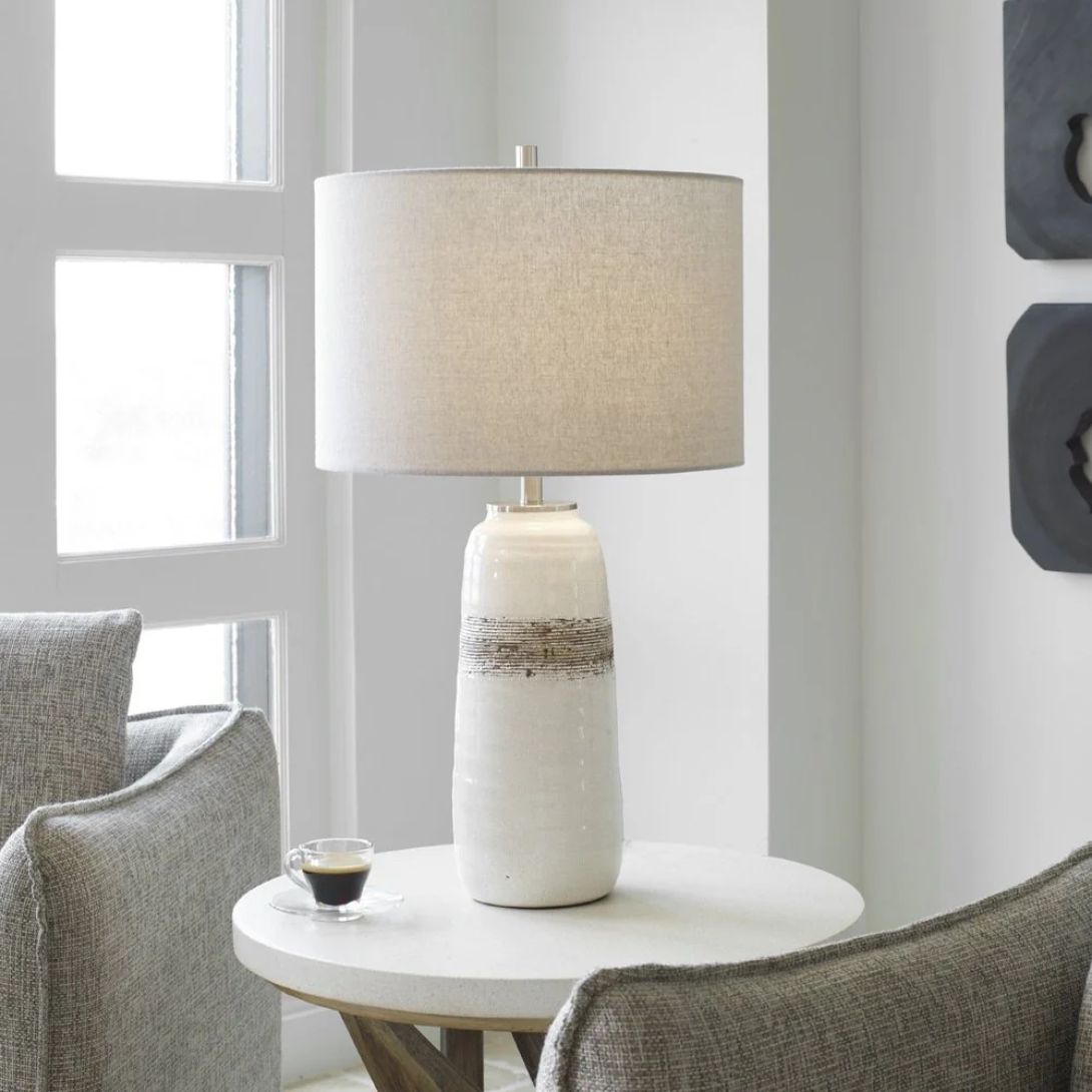 Infuse your interior with rustic charm and refined detail with the Uttermost Ribbed Ceramic Table Lamp. Showcasing a casual yet sophisticated design, this lamp features a ceramic base finished in a softly weathered off-white crackle glaze, highlighted by distressed rust brown accents and a noticeable ribbed texture that adds depth and visual interest.