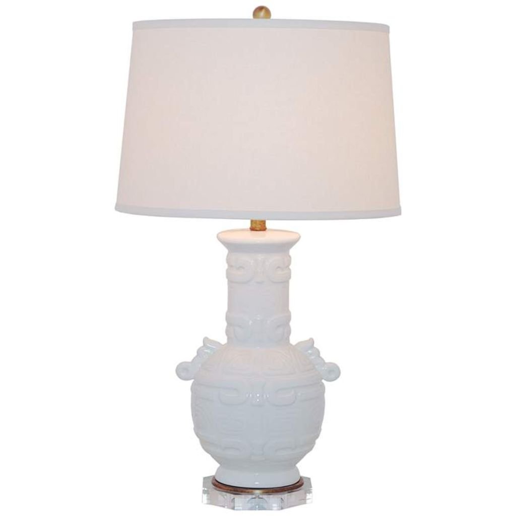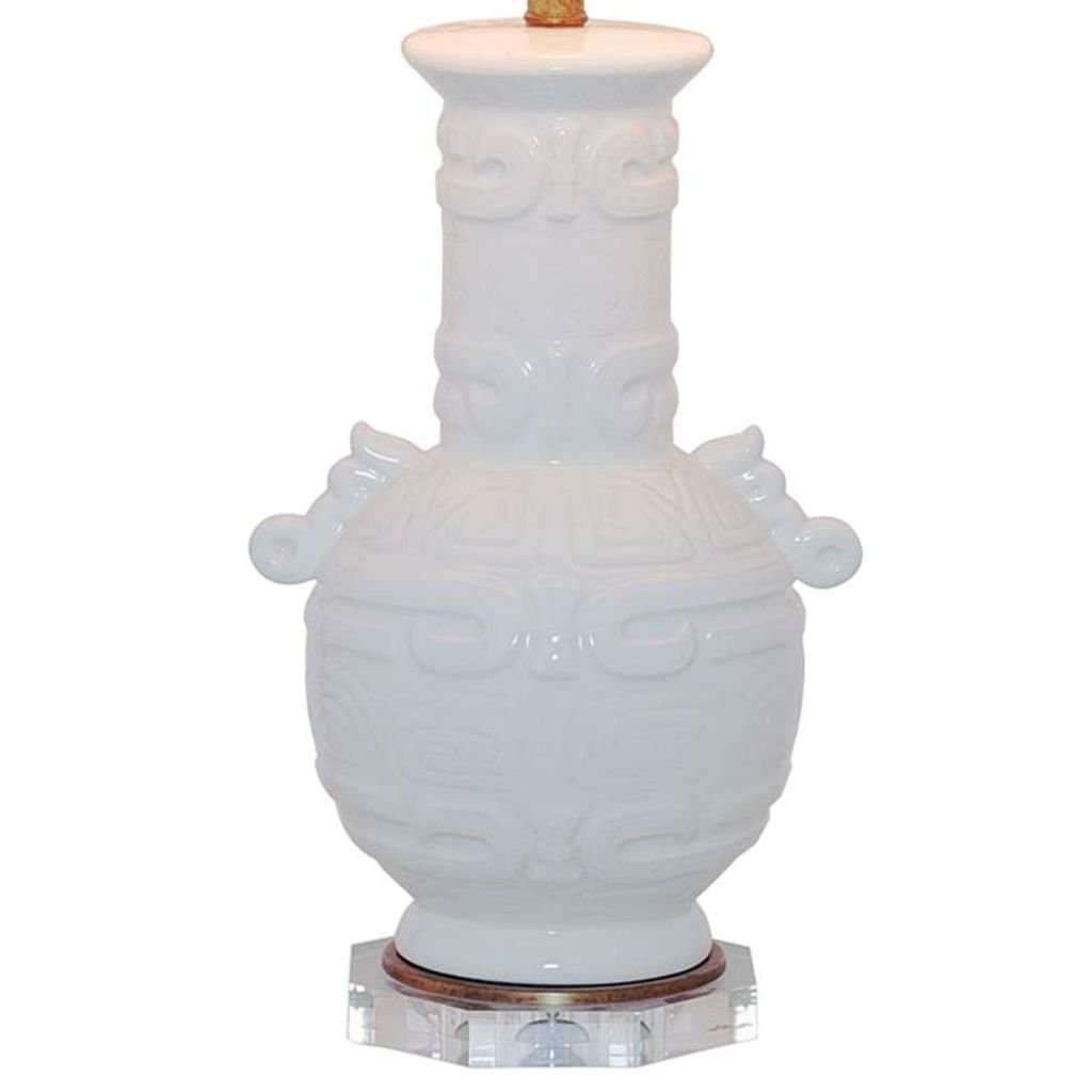 The porcelain base is shaped as a classic vase form with antique carvings pressed directly into the surface before firing. Aged brass hardware accents the neck and fittings, while an octagonal lucite accent at the very bottom adds an unexpected modern contrast to the traditional silhouette.