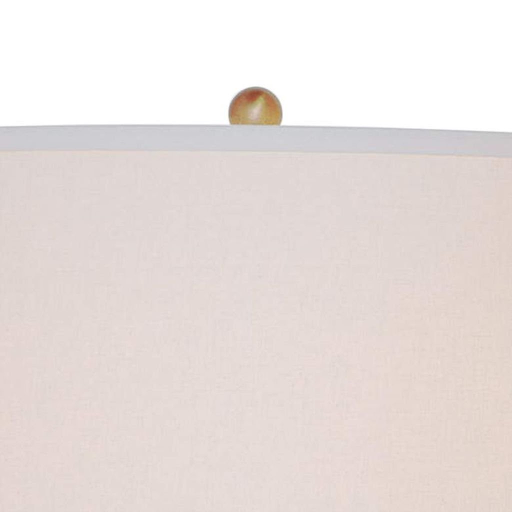 - Materials: Handcrafted porcelain base, lucite accent, aged brass hardware, natural linen shade, metal finial