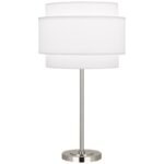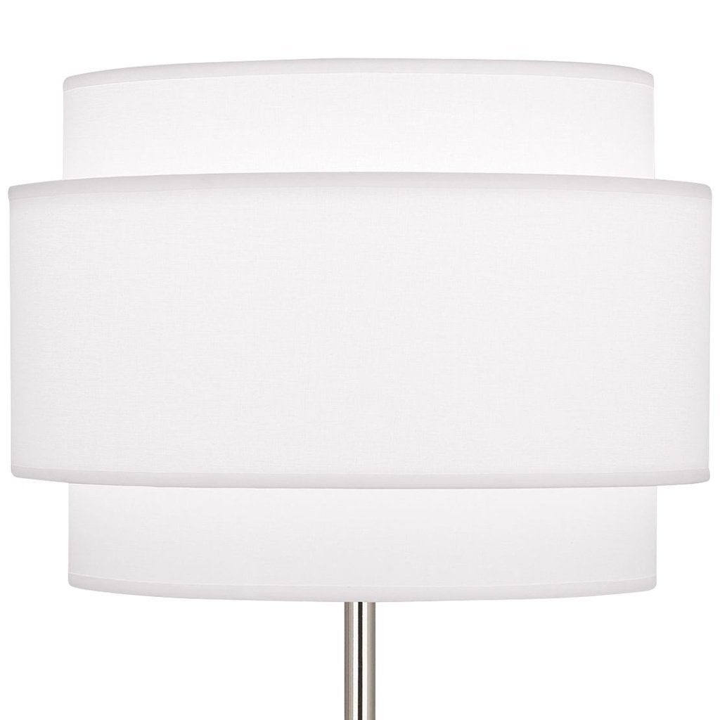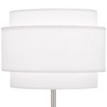 • Color/Finish: Polished nickel finish over steel construction. Ascot white fabric double drum shade.