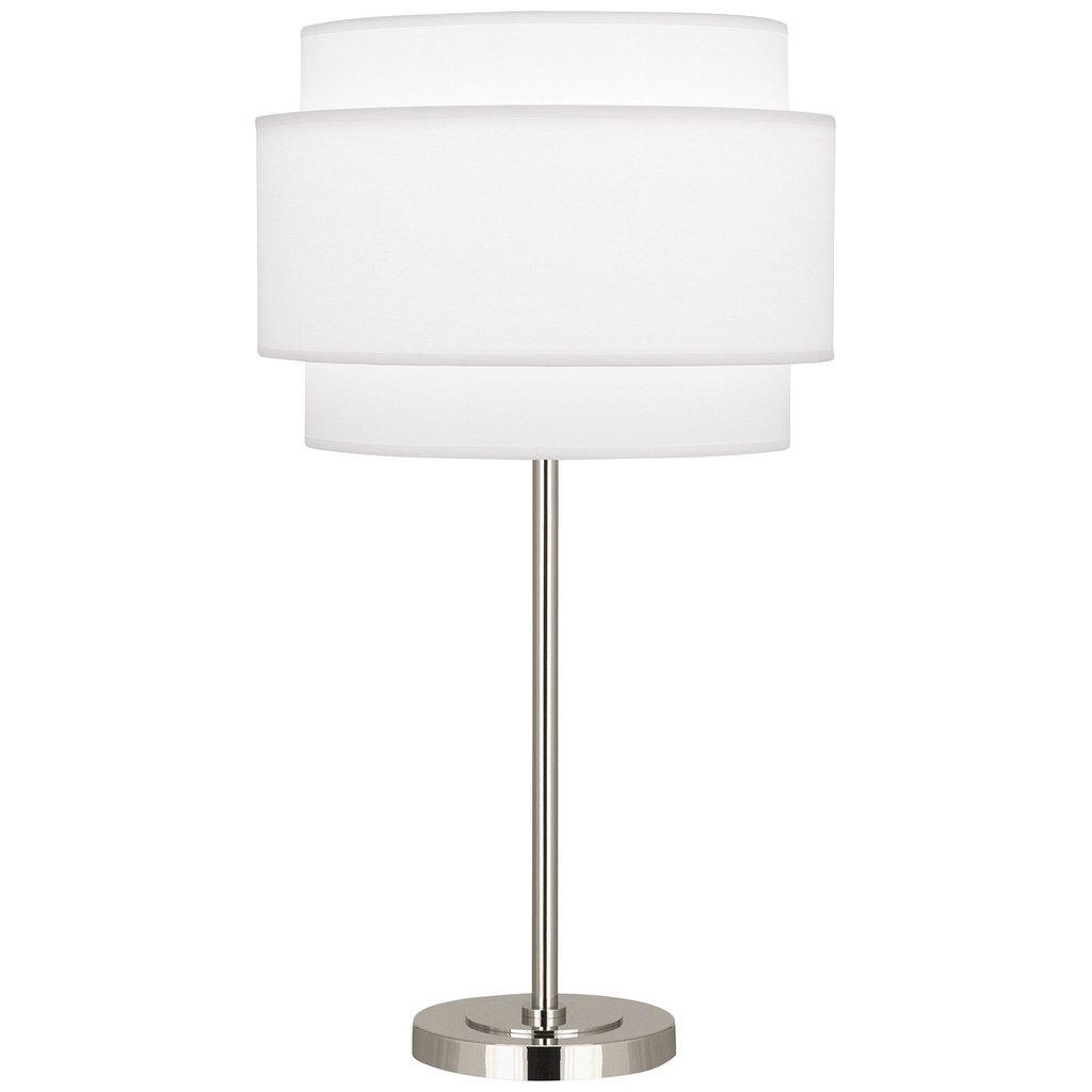 • Materials: Polished nickel finish over steel construction. Ascot white fabric double drum shade.