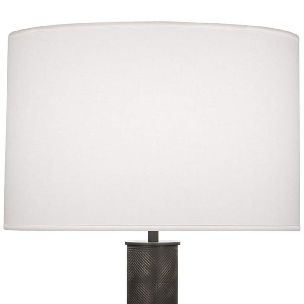 The deep patina bronze finish gives the steel construction a richness that flat or brushed metal simply cannot match — it reads differently under natural light, artificial light, and evening dimming, shifting from warm brown to near-black depending on the hour. The column form is deliberately simple, letting the finish do the work. A wide 7-inch round base anchors the silhouette with confidence, while the Ascot white fabric drum shade introduces softness and contrast at the top. The two-tone pairing — dark patinated metal against clean white linen — is the kind of combination that works in contemporary, transitional, and even industrial-leaning interiors without adjustment.