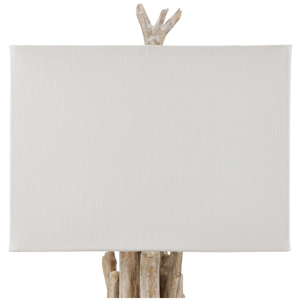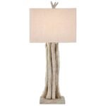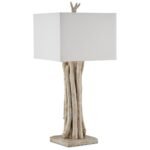- Materials: Driftwood table lamp. Organic-look tree trunk base. Designer style from the Currey and Company lighting brand.