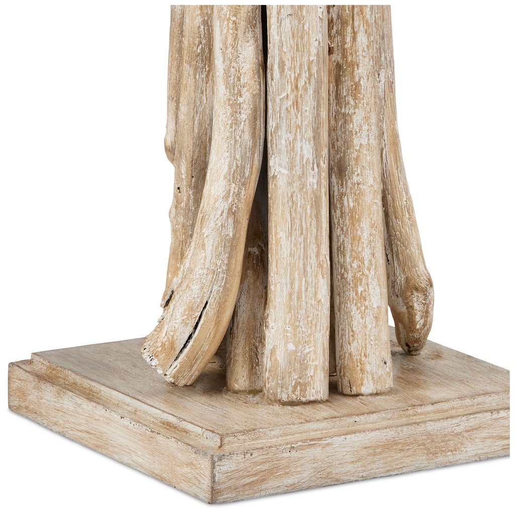 - Color/Finish: Crafted from natural driftwood pieces. Wood finish square base. Soft whitewash finish enhances the raw textures and weathered patina of the woods.