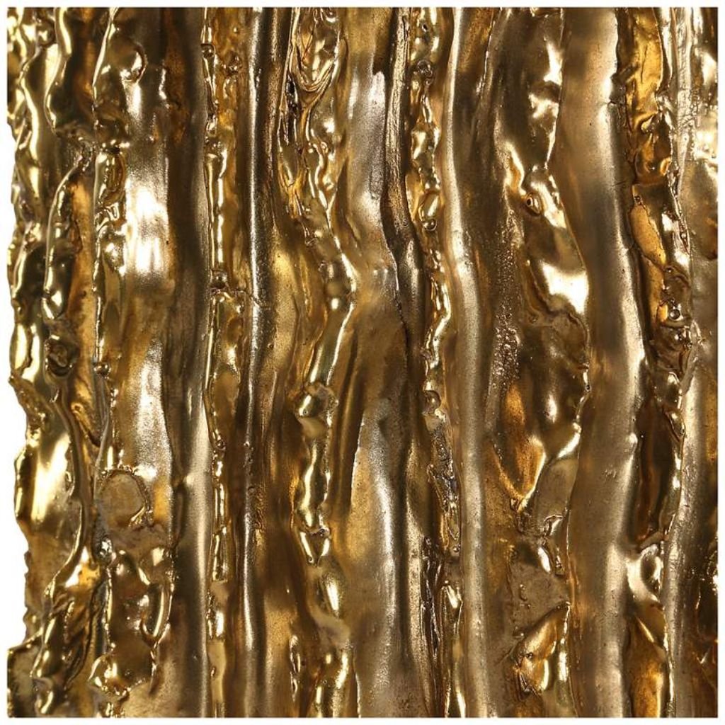 The base is sculpted with jagged, irregular edges and deep channels that run across the surface, creating strong shadow and dimension in any lighting condition. The antiqued metallic gold finish settles into those channels naturally, amplifying the carved relief work throughout.
