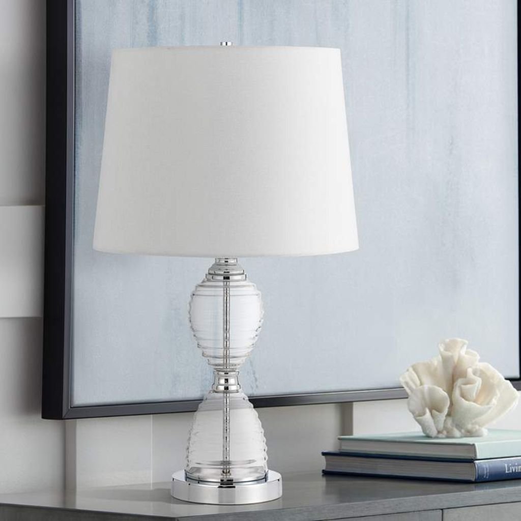 Clear ribbed glass gives this glass accent lamp its defining character — a modified hourglass silhouette with ribbed texture that catches and refracts light in a way solid bases simply cannot. Chrome finish metal accents frame the glass body cleanly, and a white linen tapered drum shade keeps the top half equally refined. It’s a versatile, modern piece that works across a wide range of interior styles without demanding attention.