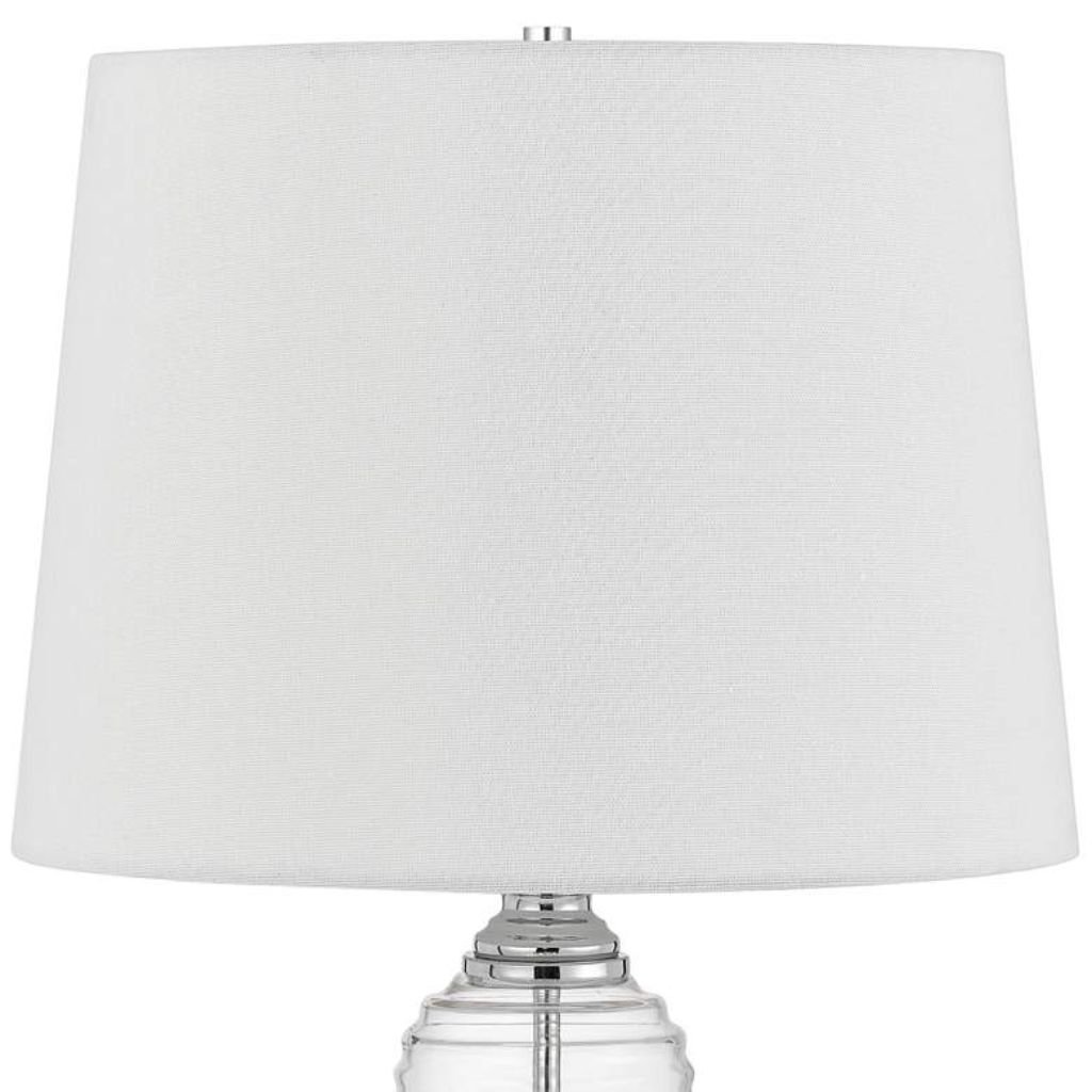 - Materials: Clear ribbed glass body, chrome finish metal frame, white linen hardback shade