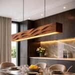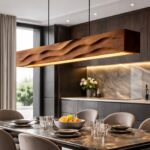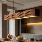 This dining light is all about clean lines and sophisticated style. Its elongated wooden body features stunning wave-like contours that interact beautifully with light. The integrated underside lighting offers a focused glow, highlighting your table without overpowering the room’s atmosphere. The slim suspension cables give a floating effect, allowing the textured wood to take center stage.