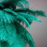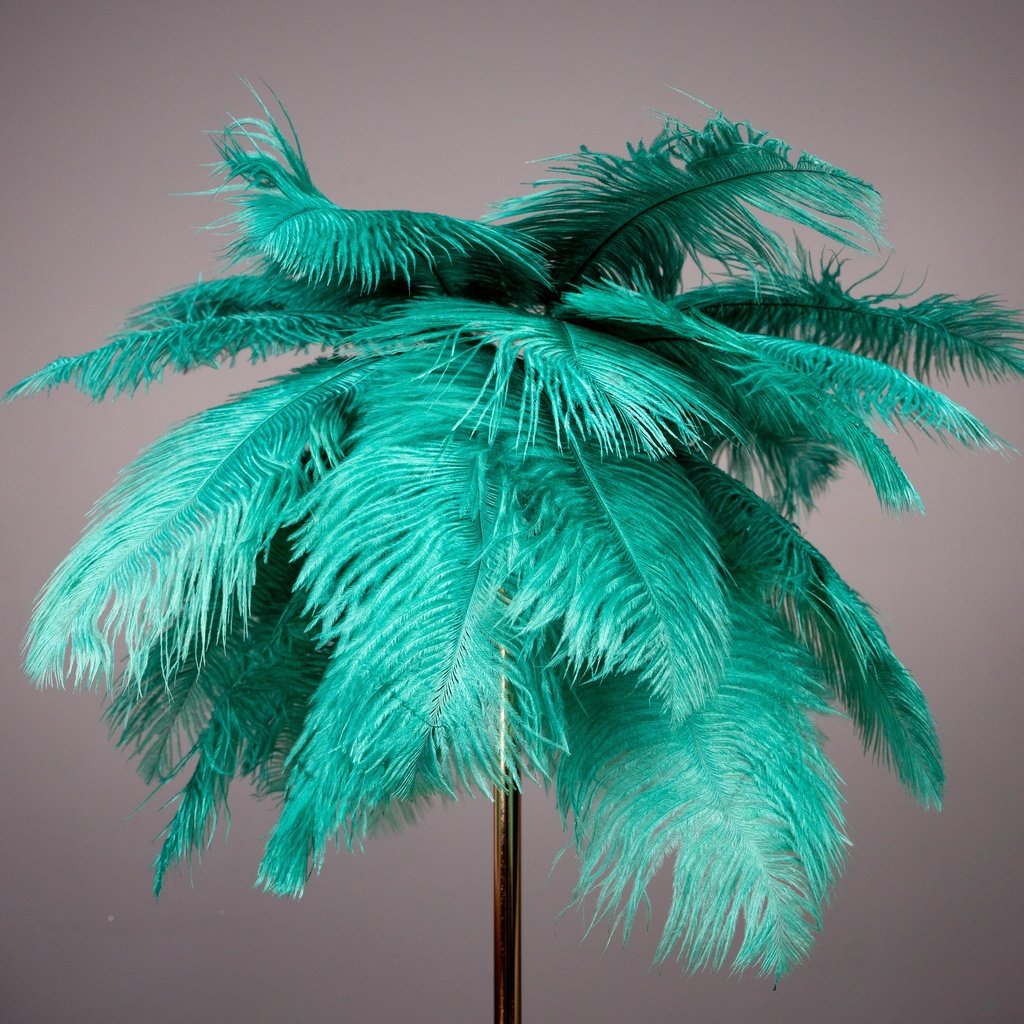 Built from deep green feathers that fan outward like tropical fronds, this emerald lamp sits on a glossy golden stem that anchors the whole composition. It functions as a lamp but reads immediately as a decorative statement in any room it occupies.