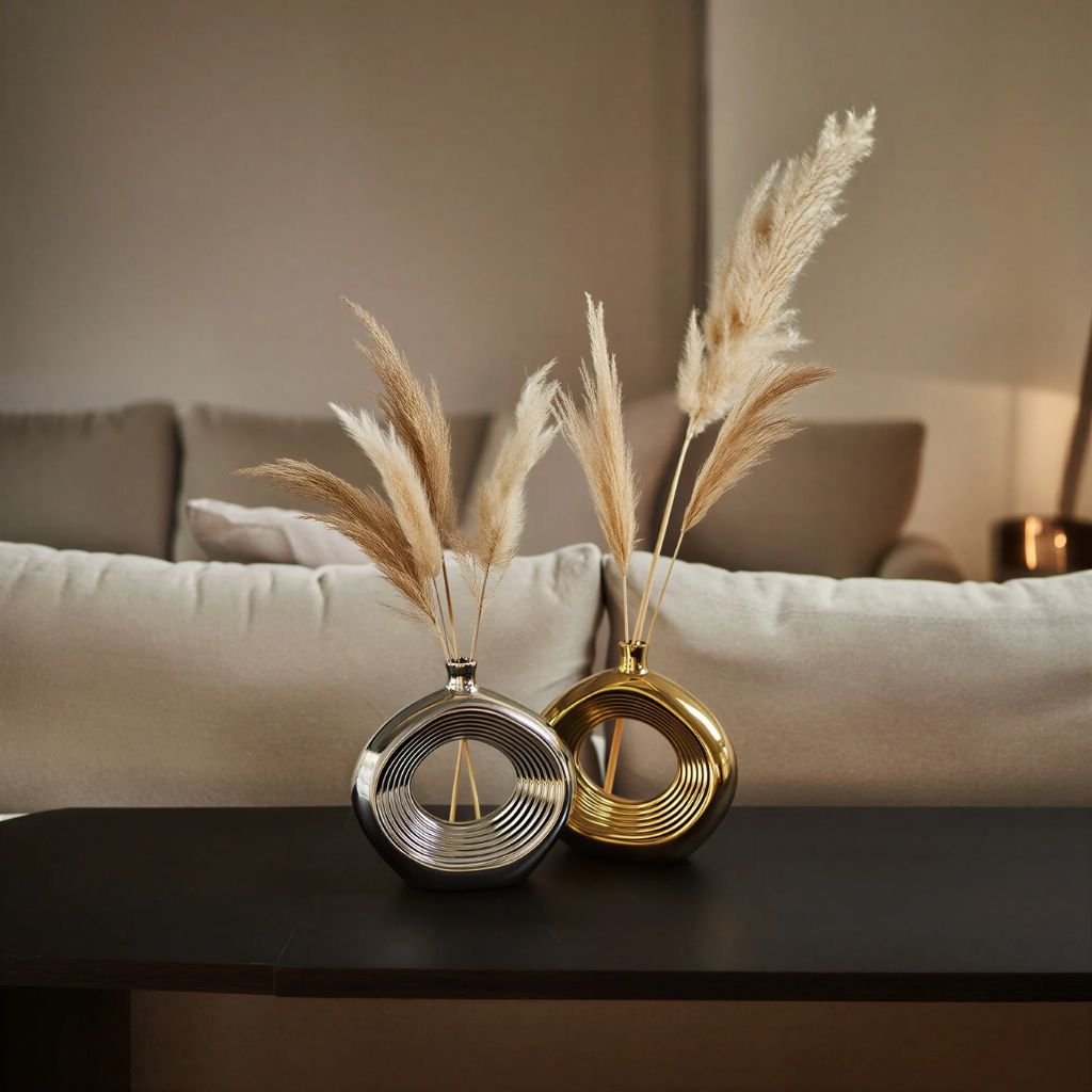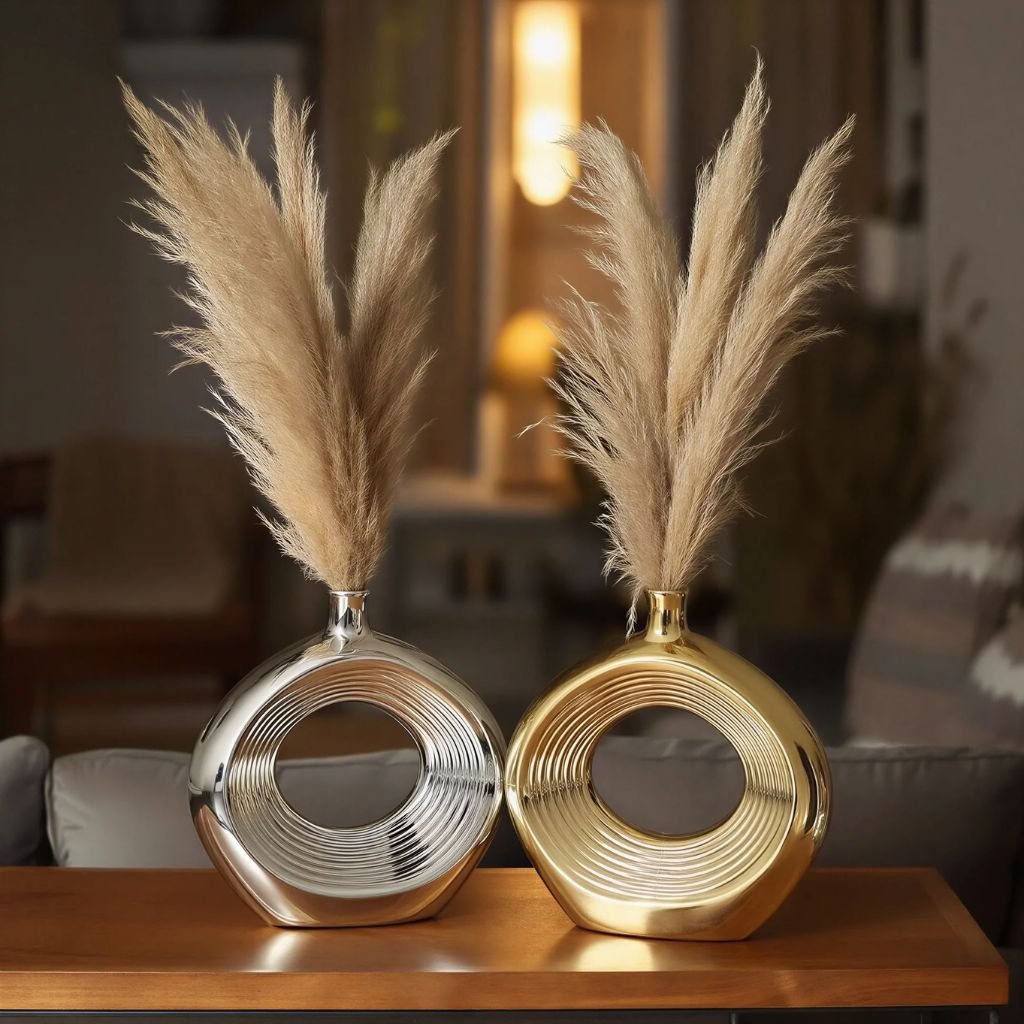 This paired set of circular hollow sculptural vases brings a gallery-quality presence to modern interiors through concentric detailing and a polished metallic finish. Each piece is crafted from ceramic and shaped into a perfectly balanced ring form that feels architectural without appearing rigid. Available in silver and gold, the set functions as both decorative sculpture and a practical vase for minimal floral styling.