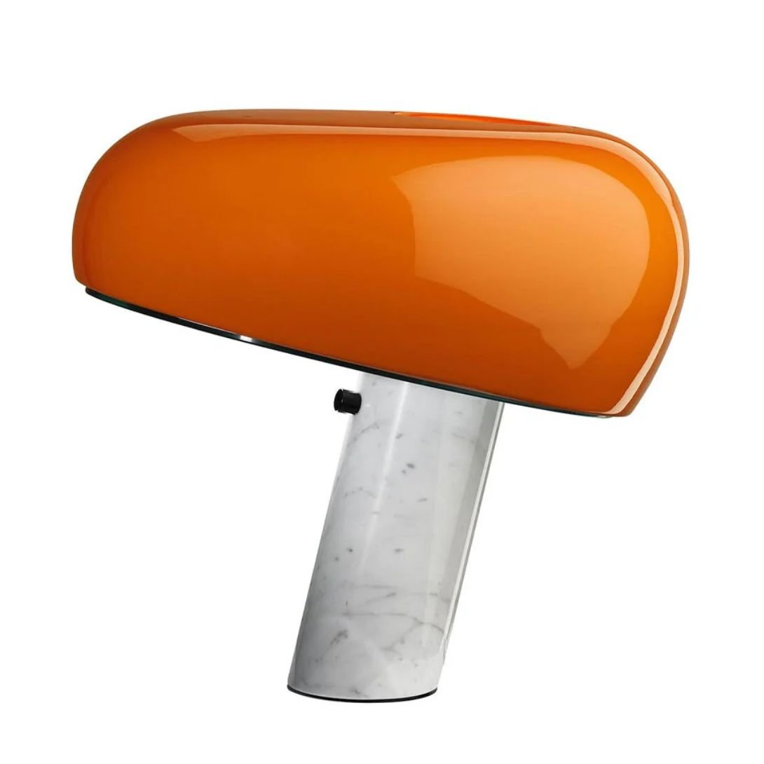 The Snoopy Table Lamp is a bold and playful lighting piece that fuses mid-century charm with modern functionality. Designed with a refined aesthetic, it features a solid Carrara marble base and a beautifully curved enamelled glass shade, creating a striking contrast between natural stone and glossy surface.