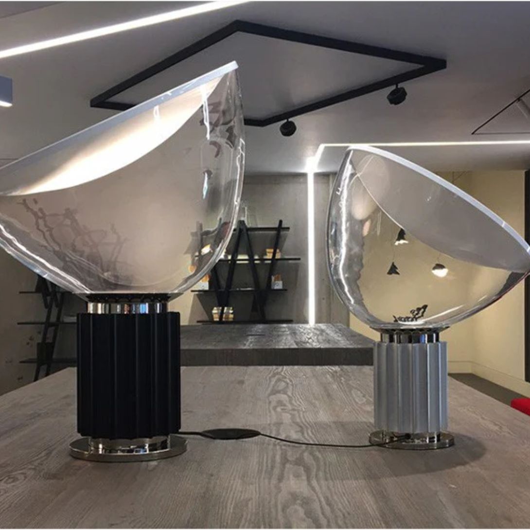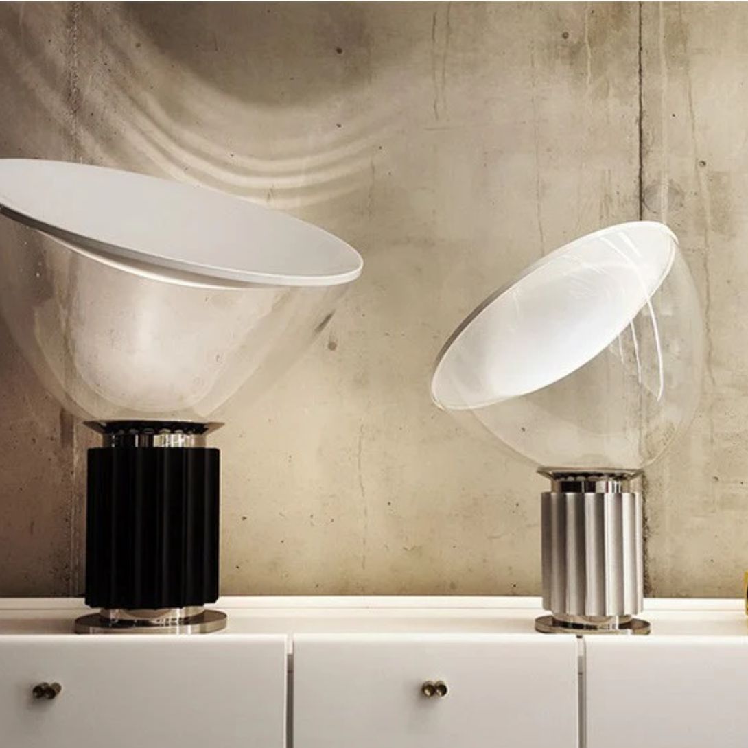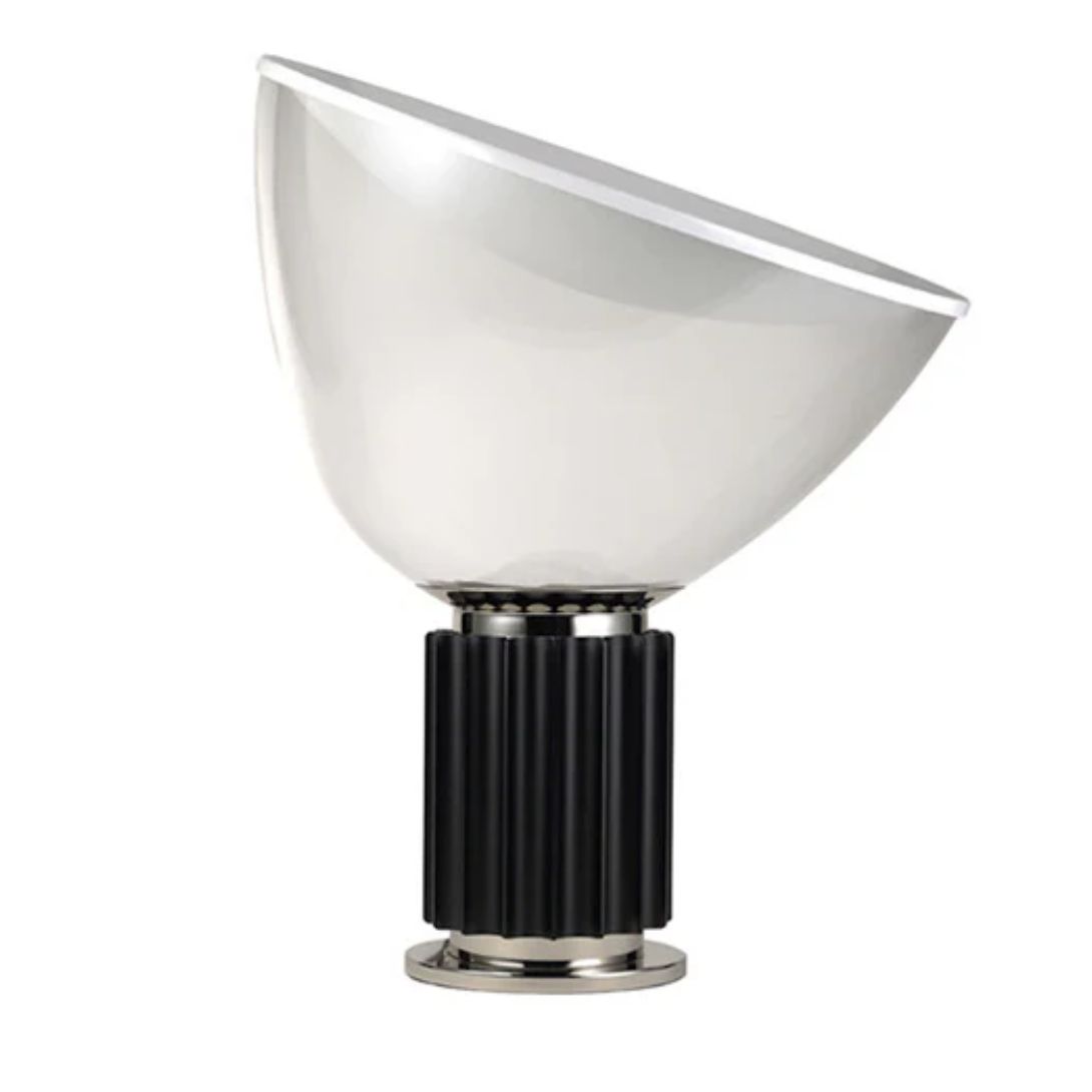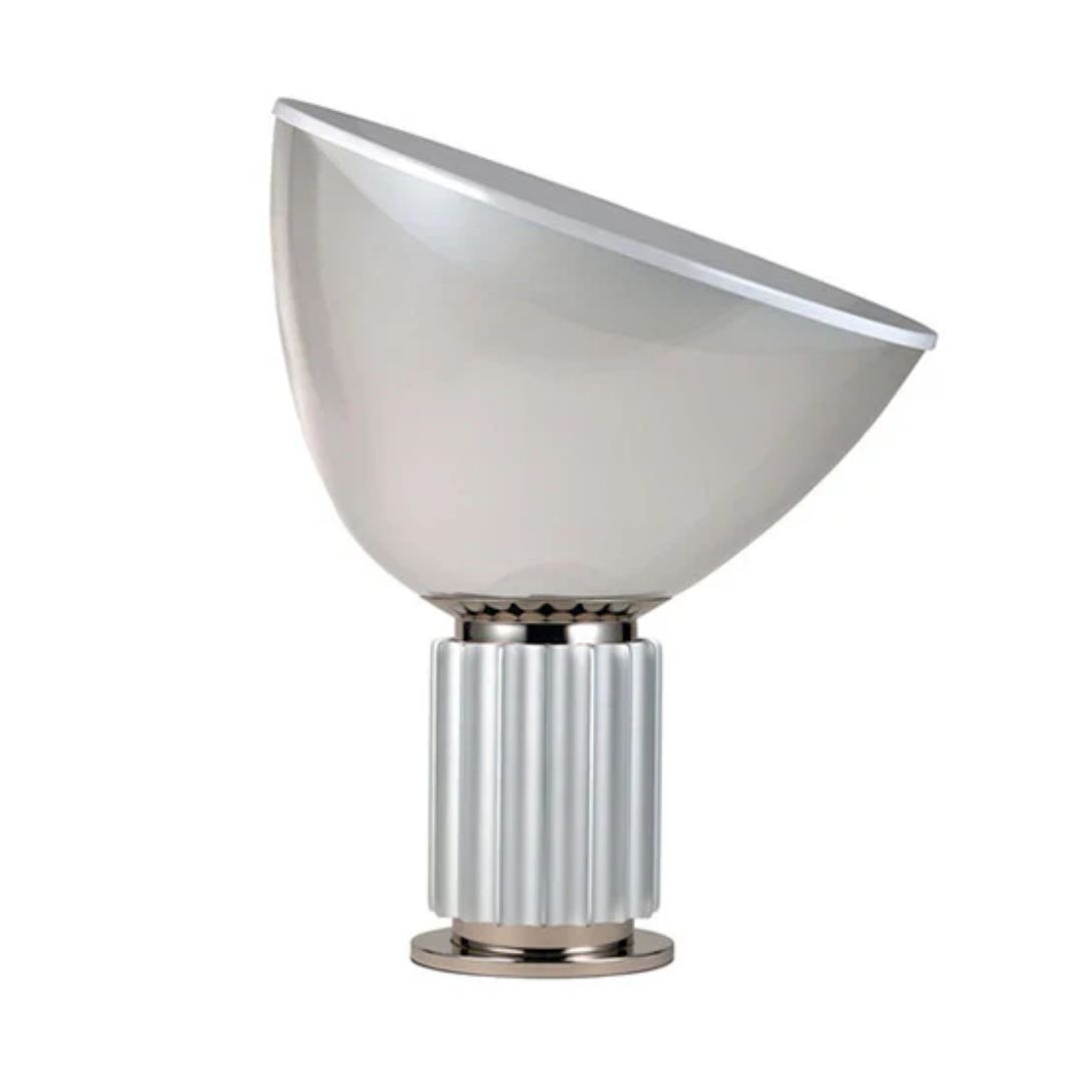 Originally designed in 1958. The Taccia Table Lamp has long been celebrated for its bold form and striking presence. First produced by Flos in 1962, the iconic design is instantly recognizable by its large blown glass diffuser and sculptural base.
