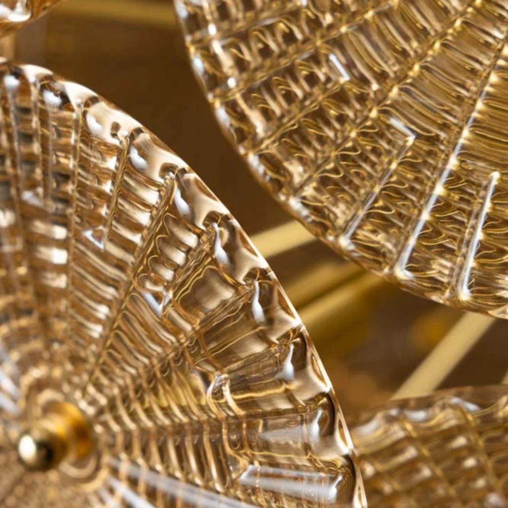 This show-stopping pendant ceiling light is built from individual ribbed amber glass discs arranged in a spherical form that creates a rich, sculptural statement. The warm golden glow that passes through each disc produces a layered, honeyed light quality that is genuinely extraordinary. Six G9 bulbs are required to bring the full warmth of this glass disc chandelier to life.
